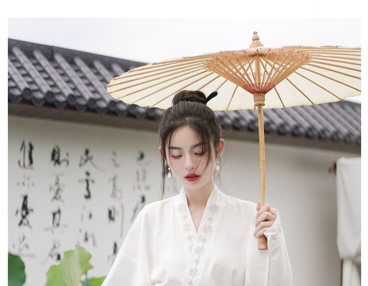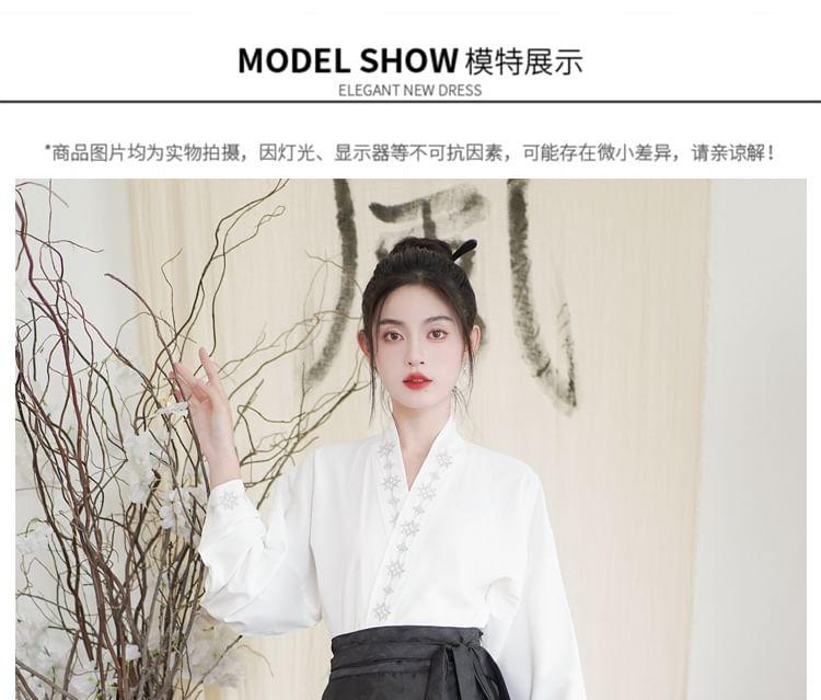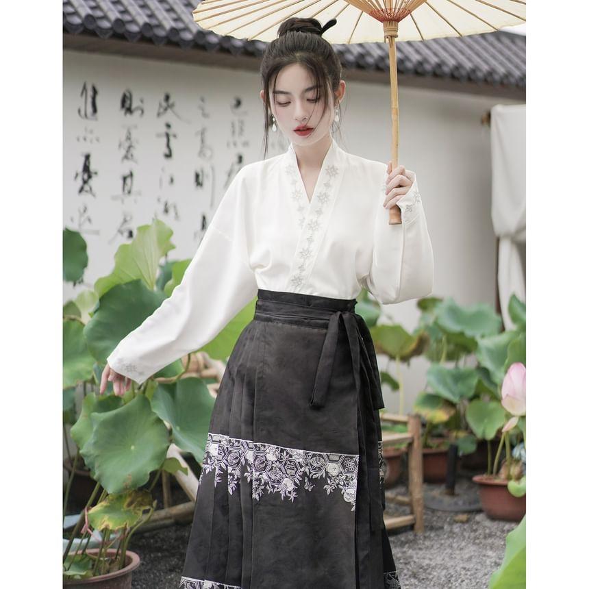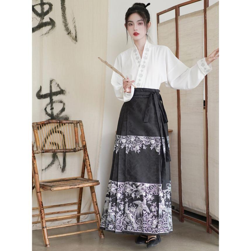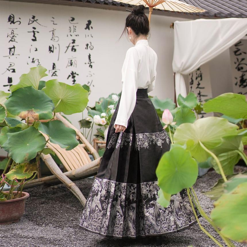 Long-Sleeve Embroidered Hanfu Top / High Waist Phoenix Patterned Pleated Maxi A-Line Skirt