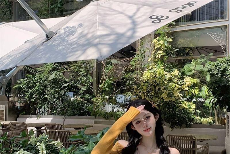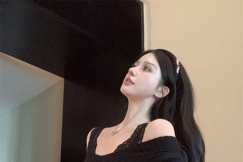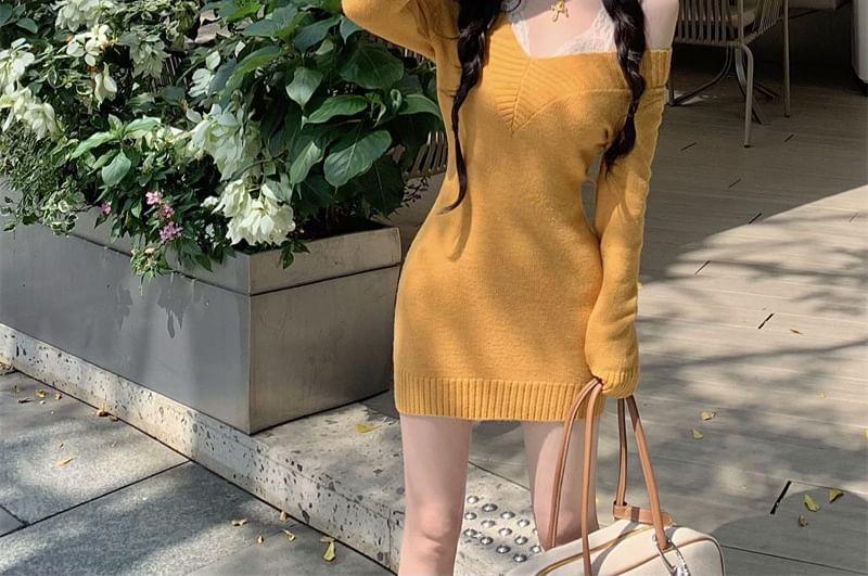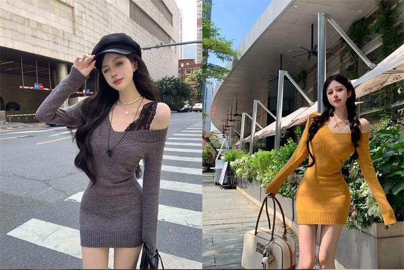 Long-Sleeve Off-Shoulder Plain Knit Mini Sheath Dress / Lace Tank Top