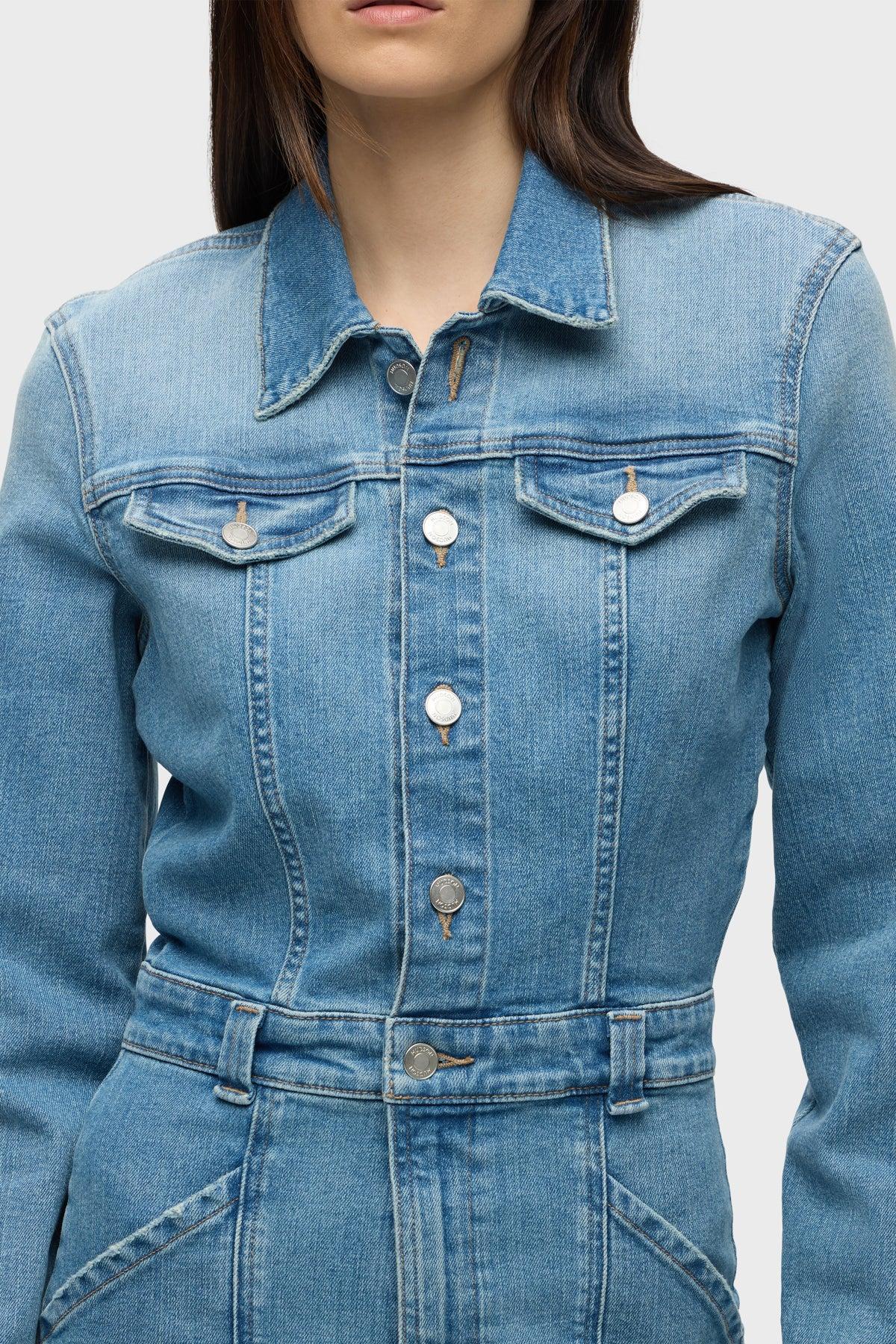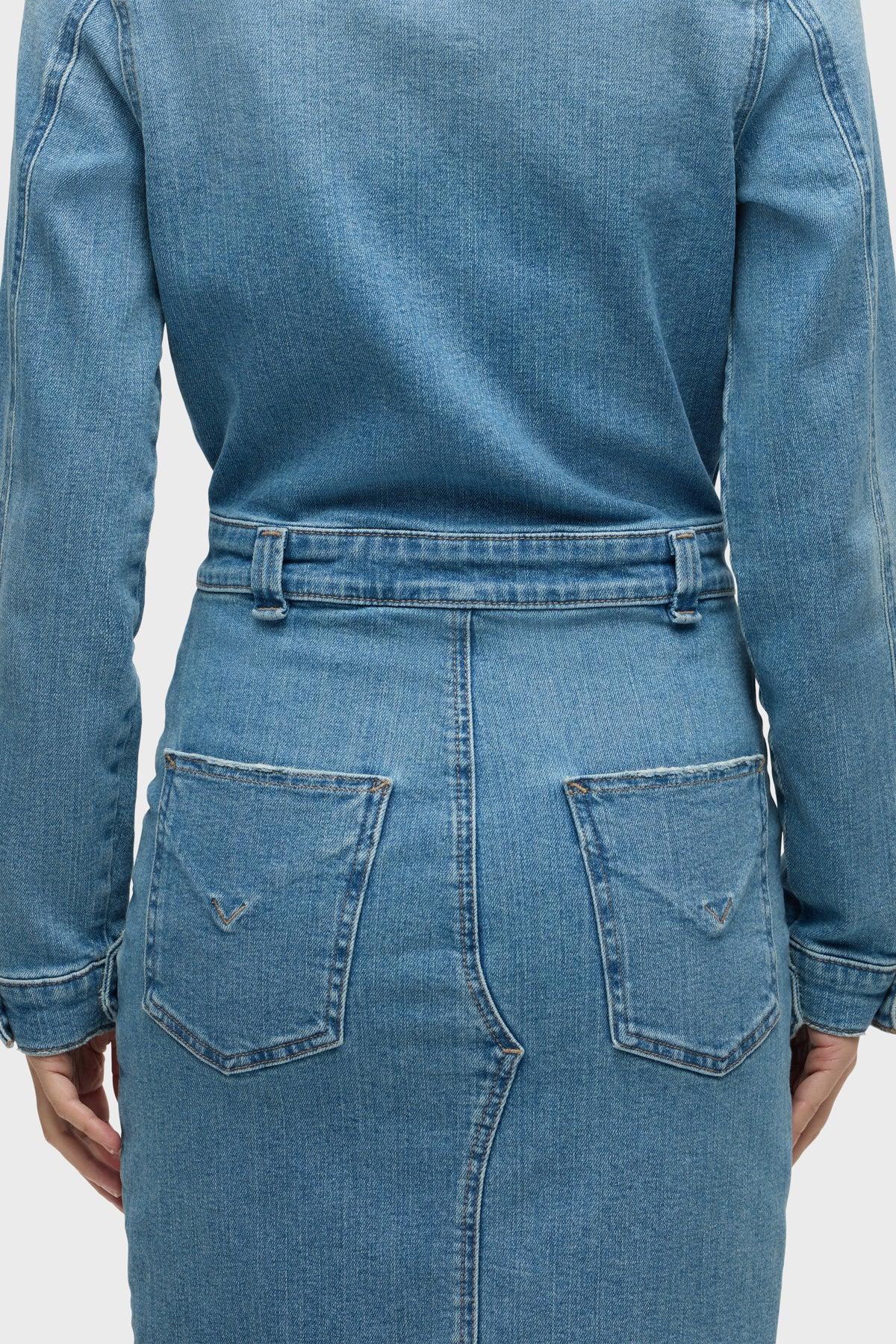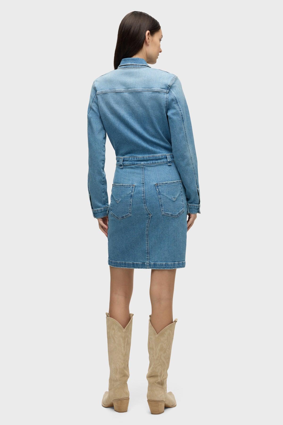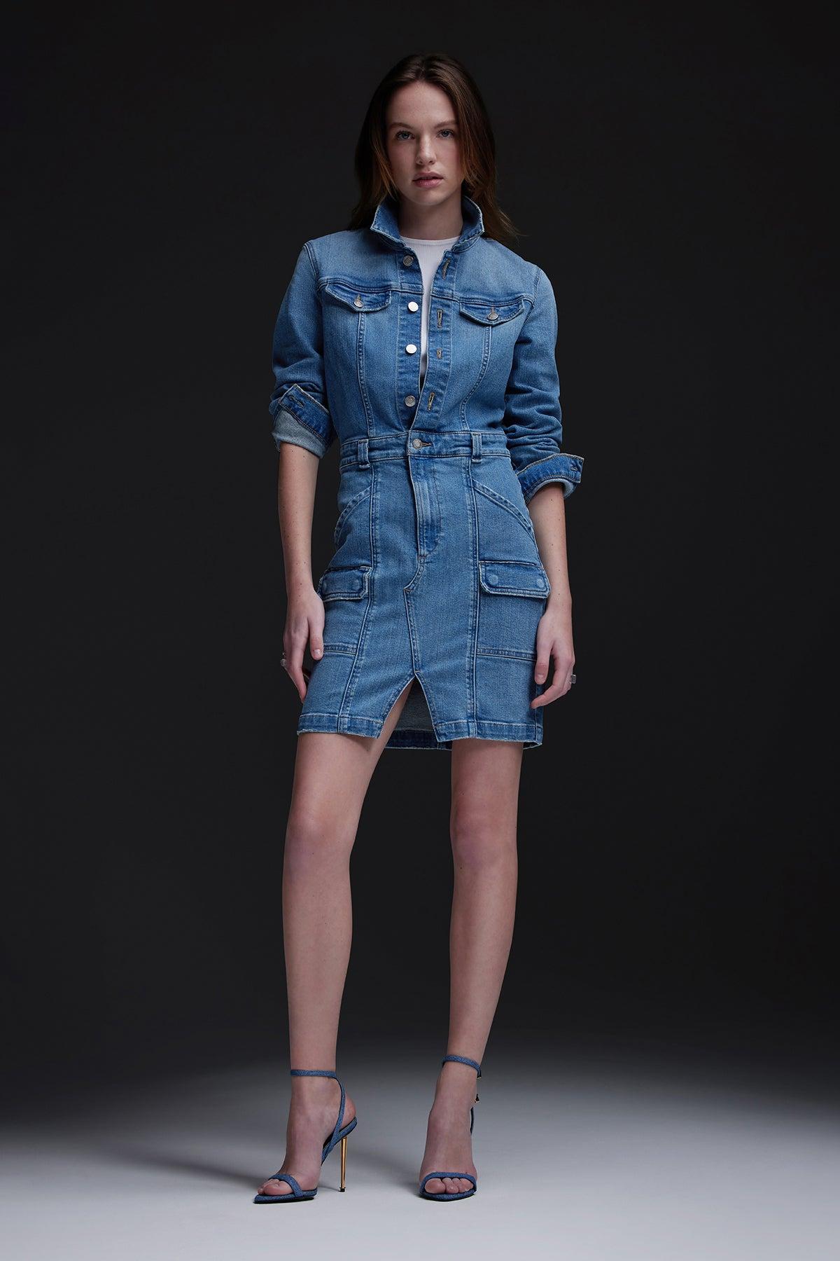 Description The Long Sleeve Reconstructed Dress in light blue Maize is cut from premium comfort stretch denim. Hitting above the knee, the dress features a pointed collar, long sleeves and cargo pockets. Product Details Body Length: 36.5", Chest: 36", Sleeve Length: 24.5"Model Height 5'9"Model wearing size SMeasurements based on size S Fit & Care Content: 95% Cotton, 3% Elasterell-P, 2% ElastaneMachine wash cold with like colorsDo not bleachTumble dry low or hang to dry