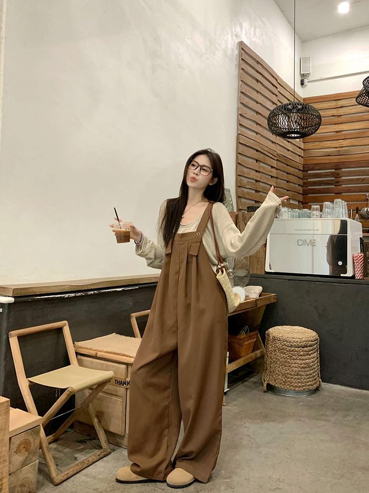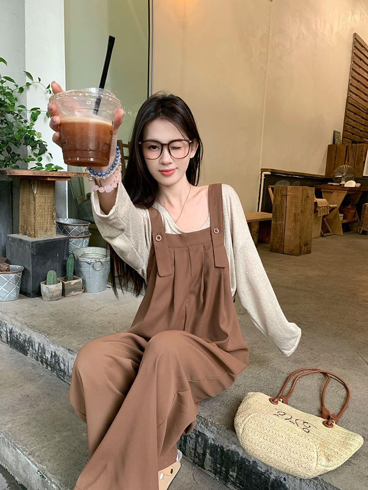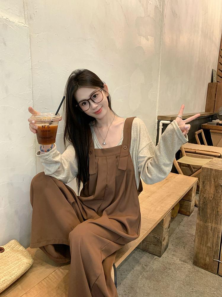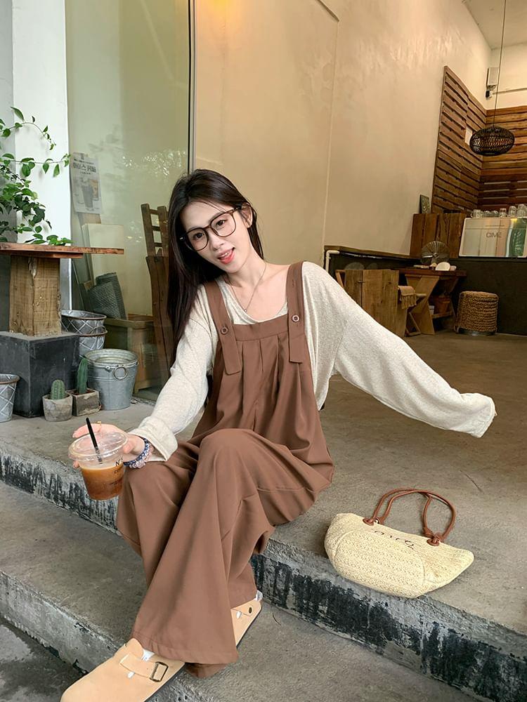Long-Sleeve Round Neck Plain T-Shirt / Wide Leg Jumpsuit