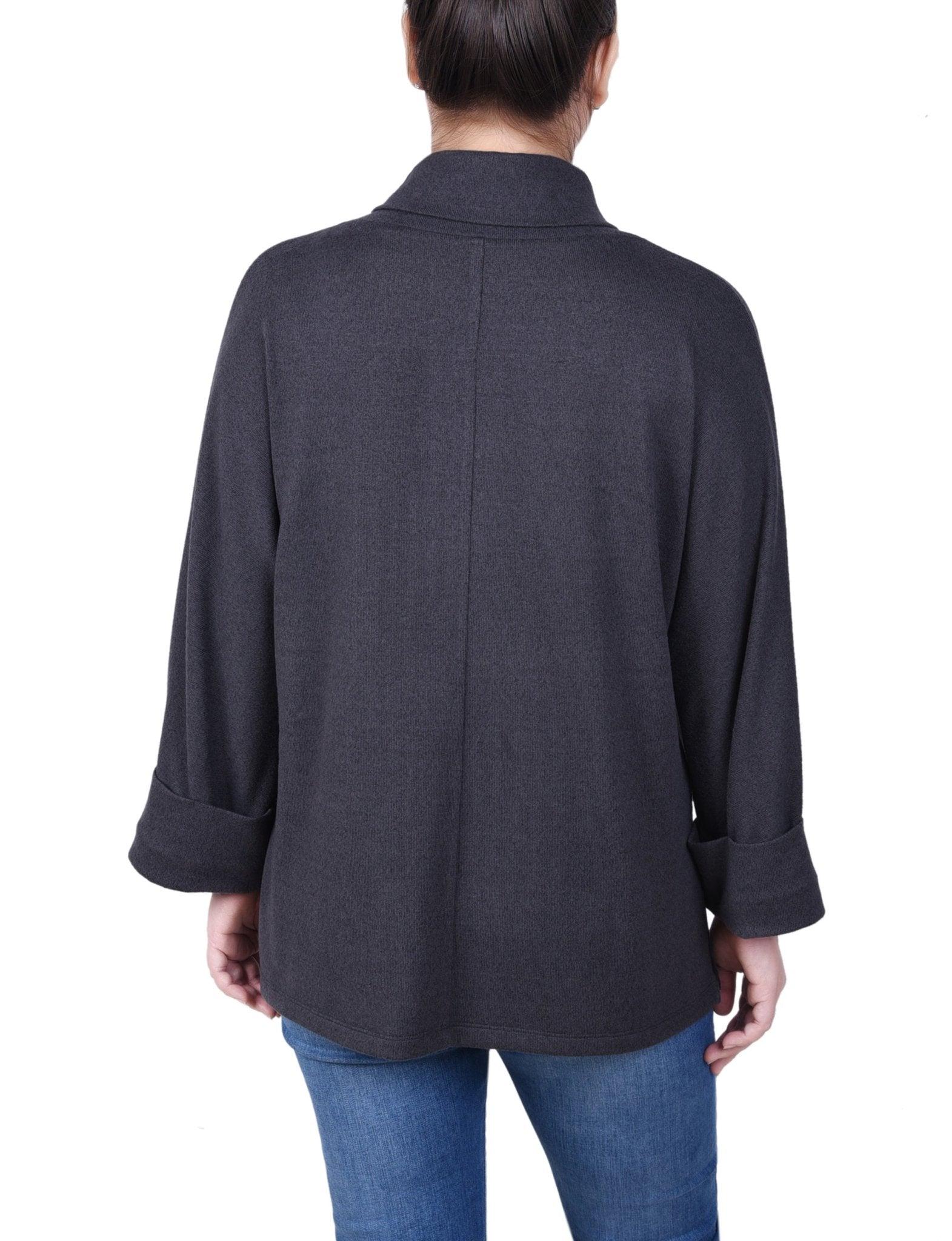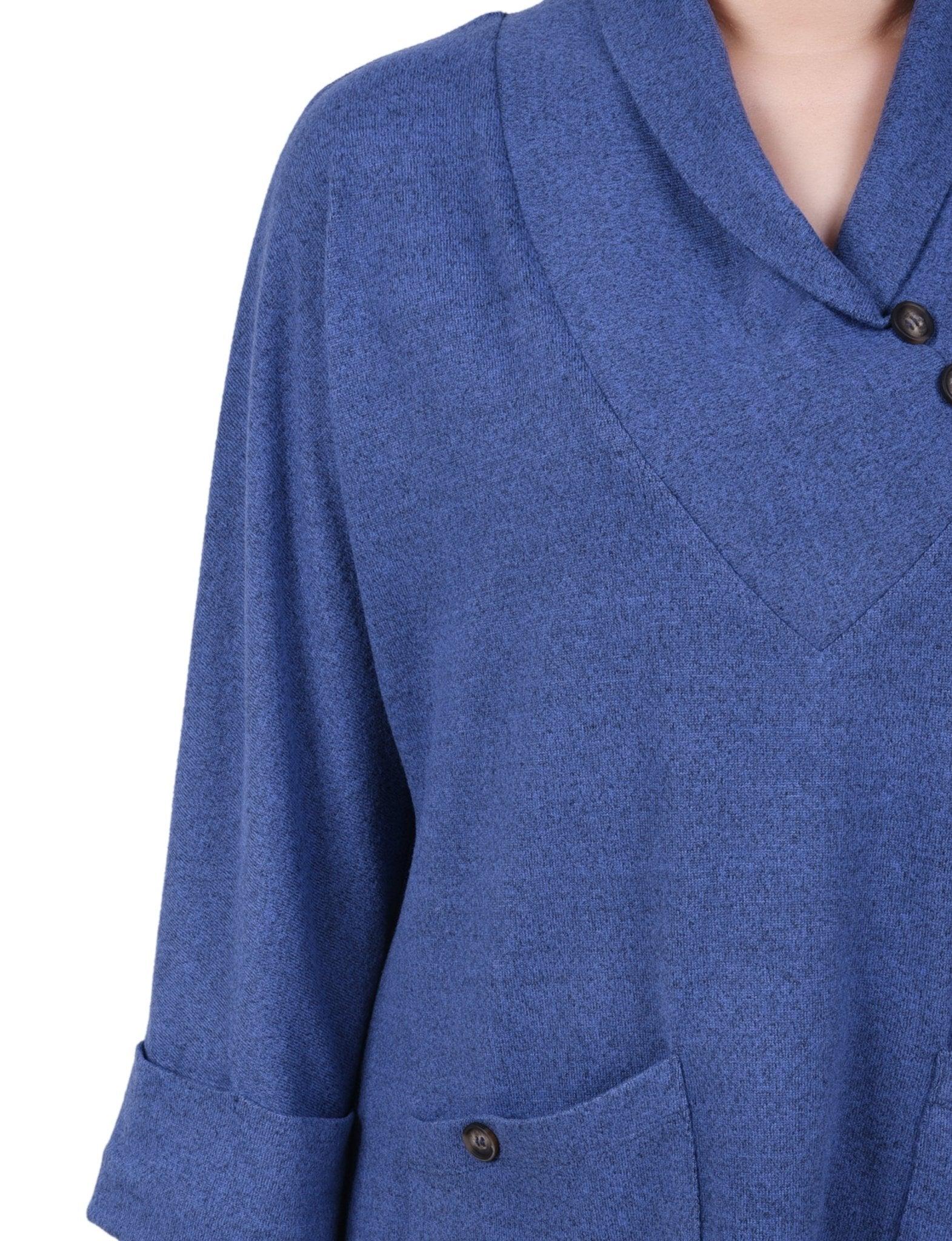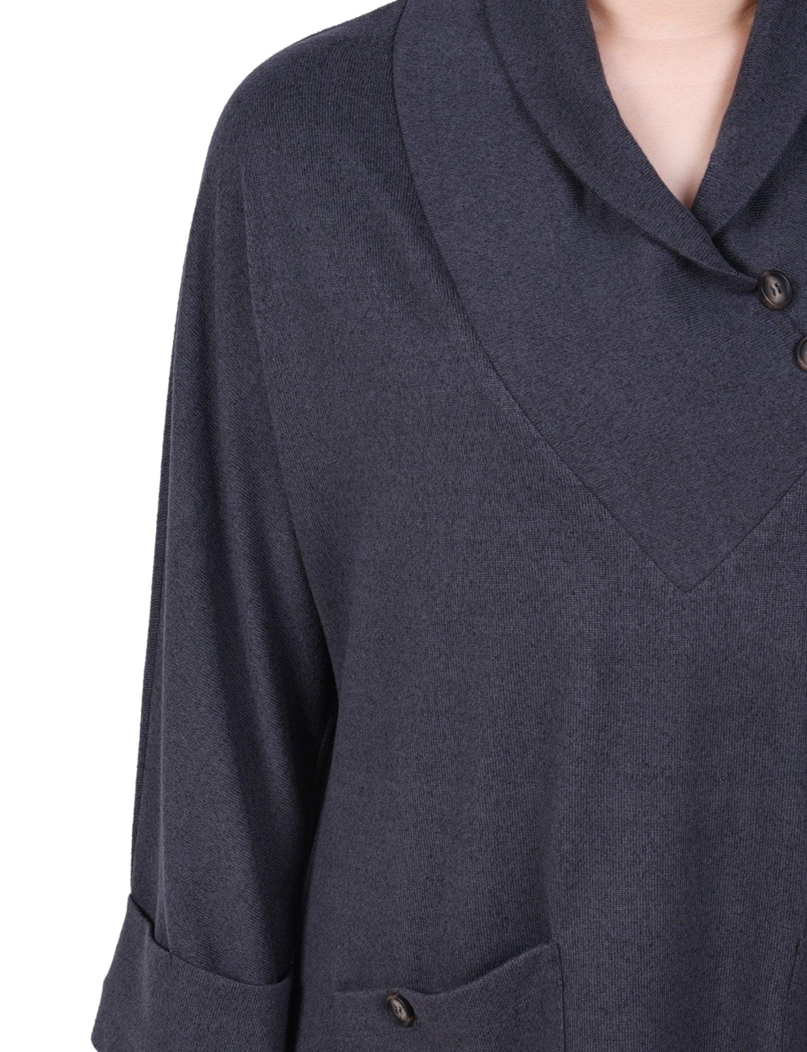 This tunic top from NY Collection is great for lounging on those chilly days. -Material: 95% Polyester, 5% Spandex -Care Instructions: Machine Washable -Product Fit: Relaxed Fit Product Specifications: -Long Cuffed Sleeves -Shawl Collar -Two Hip Patch Pockets -Decorative Buttons -Soft Sweater-Like Fabric