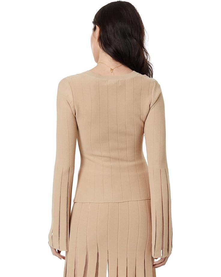 Try a dress that is sure to heat up your fashion choice by wearing en saison Brianna Top. It has a slim fit with a pull-on style. This semi-sheered stripe knit top has a V-neckline. Long sleeves with sheered stripes make it a distinction to add to your wardrobe.