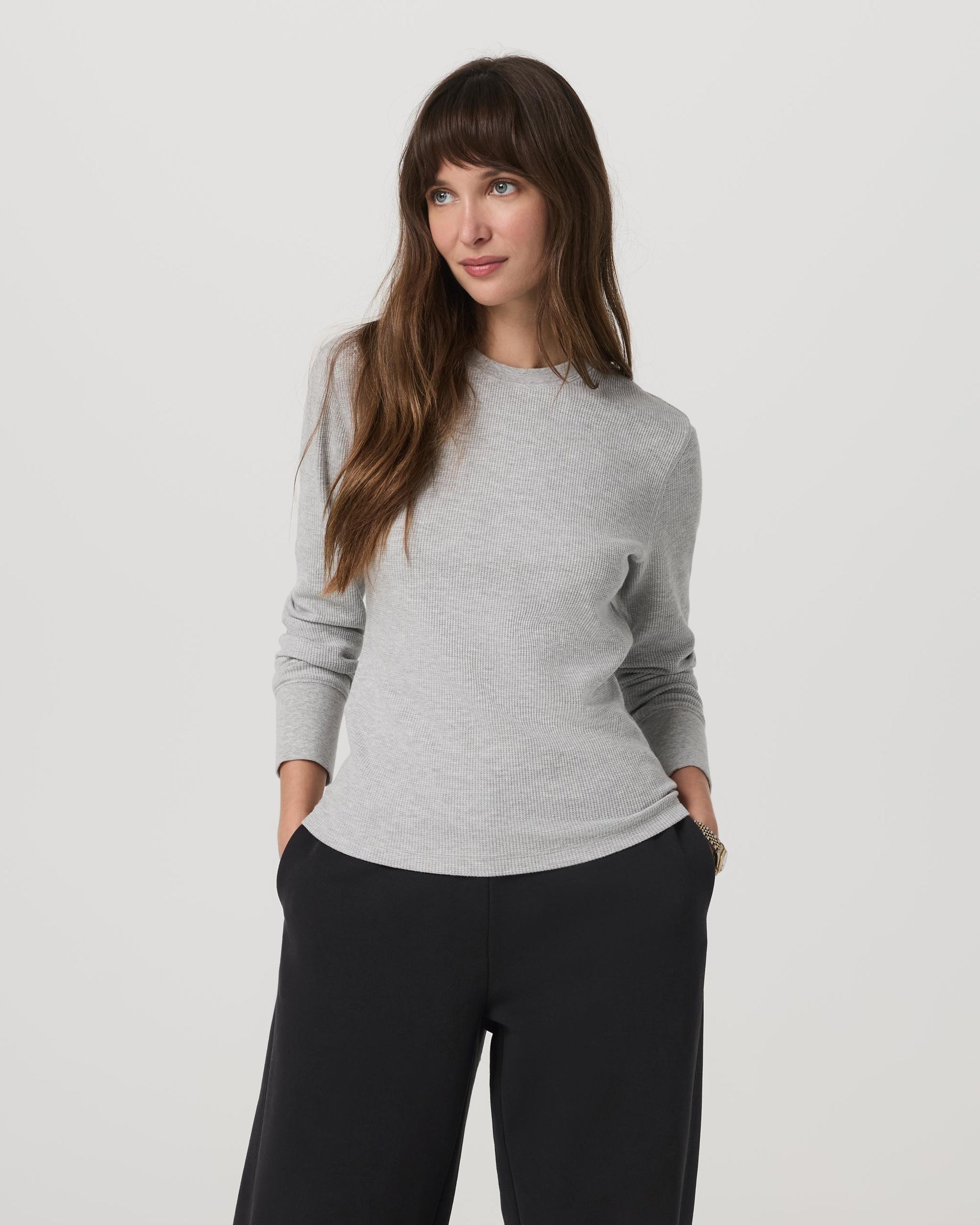 Shop the Long Sleeve Waffle Top in Light Heather Grey at Vuori. This women’s top offers soft waffle texture, ribbed cuffs & a relaxed fit for layering.