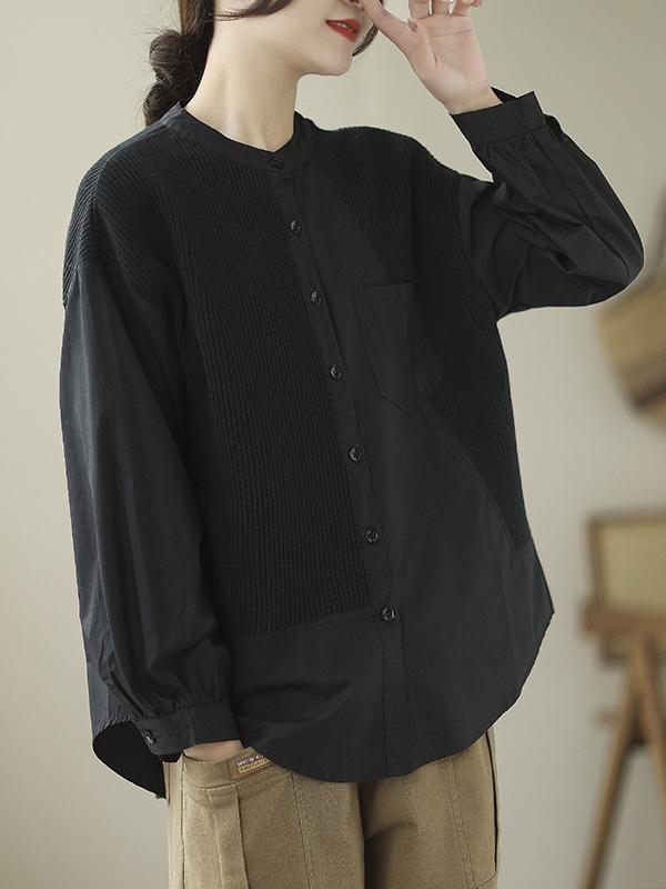 Long Sleeves Loose Asymmetric Buttoned Pockets Split-Joint Round-Neck Blouses&Shirts Tops