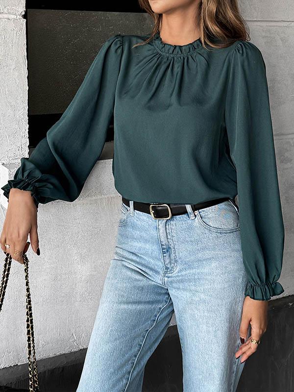 Experience refined femininity with our NewIn long-sleeve blouse, featuring pleated fabric, delicate ruffle trims, elastic comfort, and a sophisticated mock neck. Perfect for stylish office or casual wear. Shop now for fast delivery and exclusive offers!
