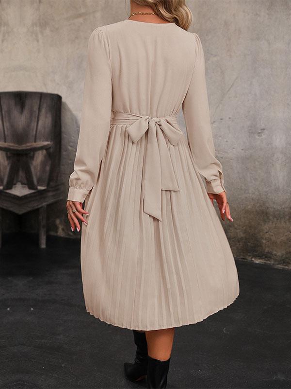 Embrace effortless elegance with this midi dress, featuring long sleeves and a loose, flowing silhouette. The pleated design adds sophistication, while the split-joint and tied waist detail offer a flattering fit. The round neck completes the classic look, making it a versatile choice for various occasions.