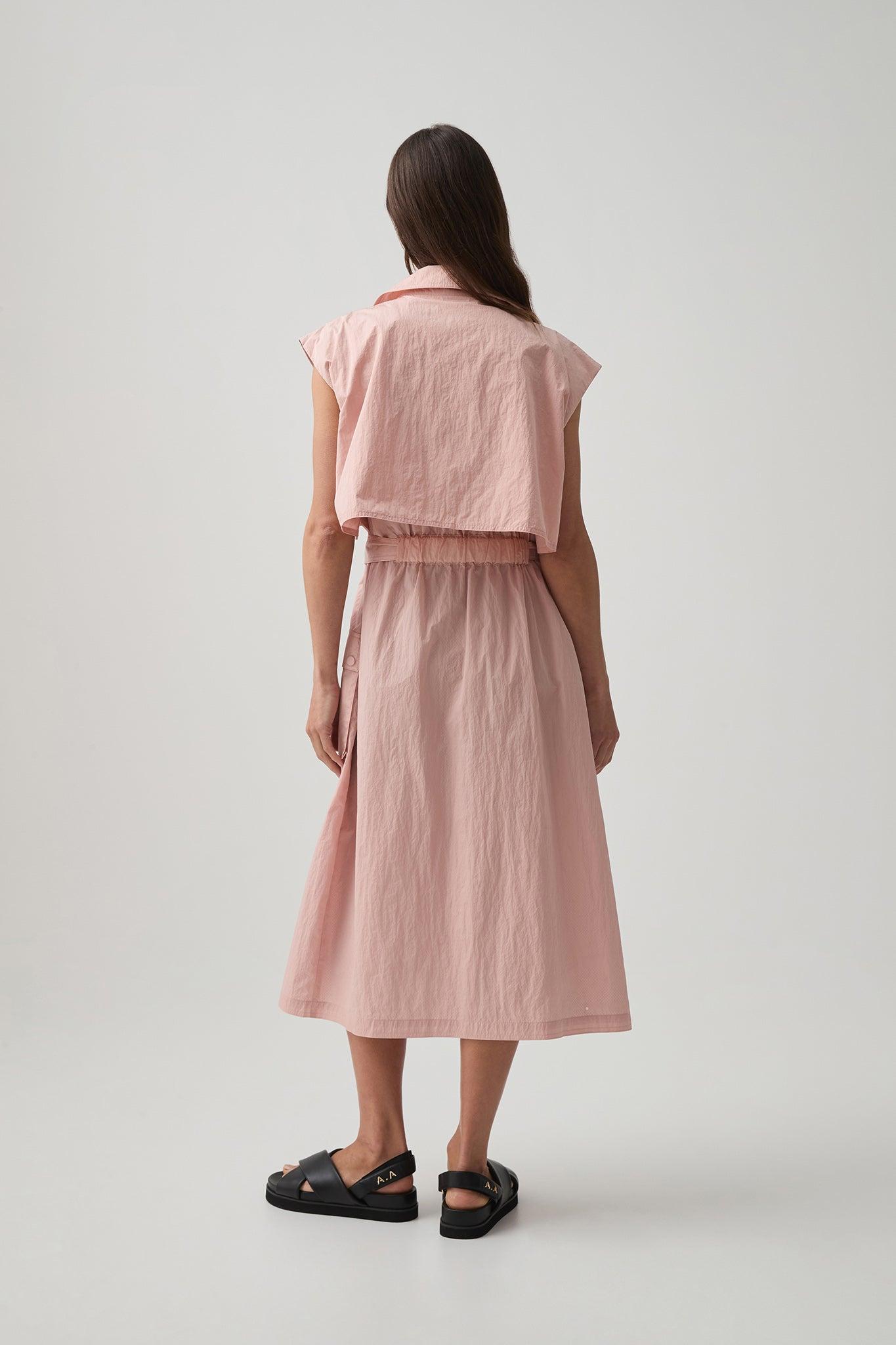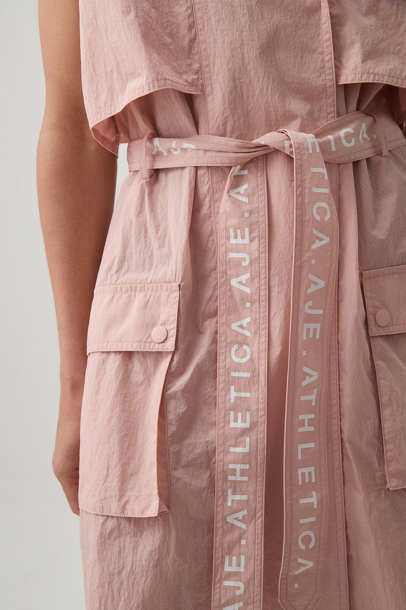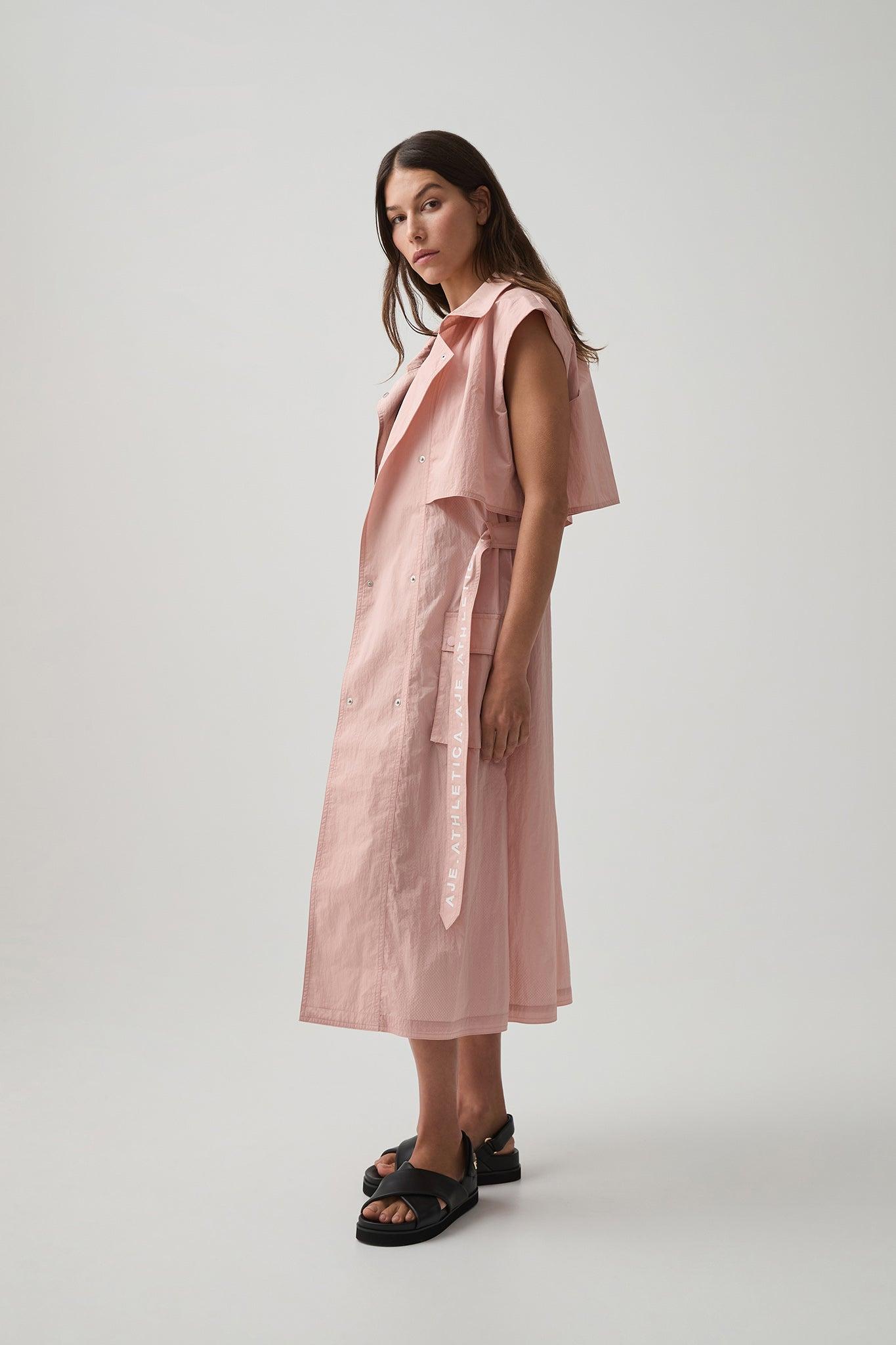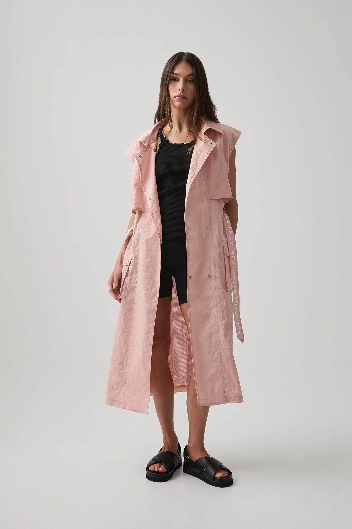 PRODUCT DETAILS Sleeveless spray trench vest Midi length Classic collar Front and back storm flap Double-breasted snap closure Oversized pockets Self tie logotape belt SIZE & FIT Helena wears a size 8/S and is 173cm/5’8” FABRICATION 100% Recycled Nylon