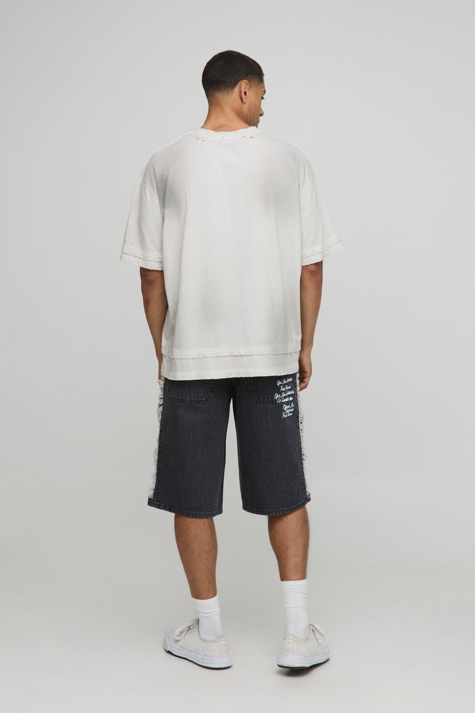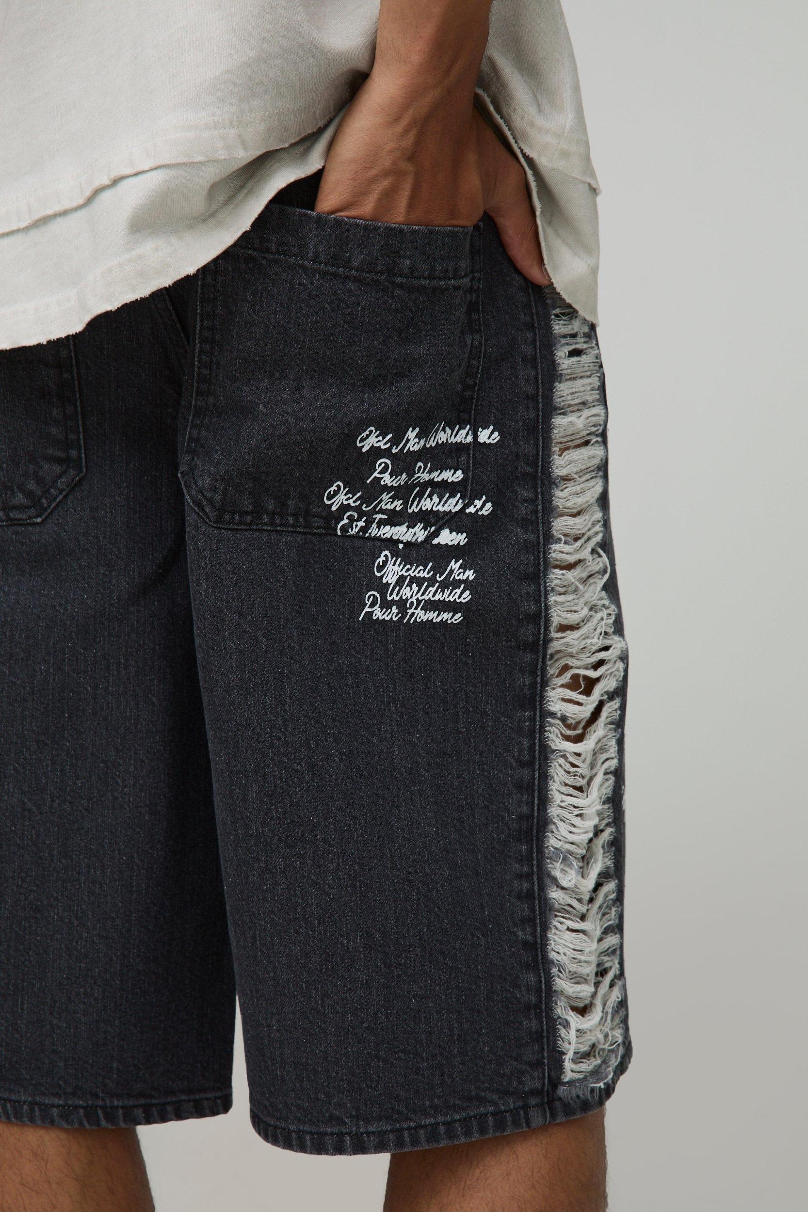 Longline Rigid Printed Distressed Gusset Jorts In Charcoal | boohooMAN USA