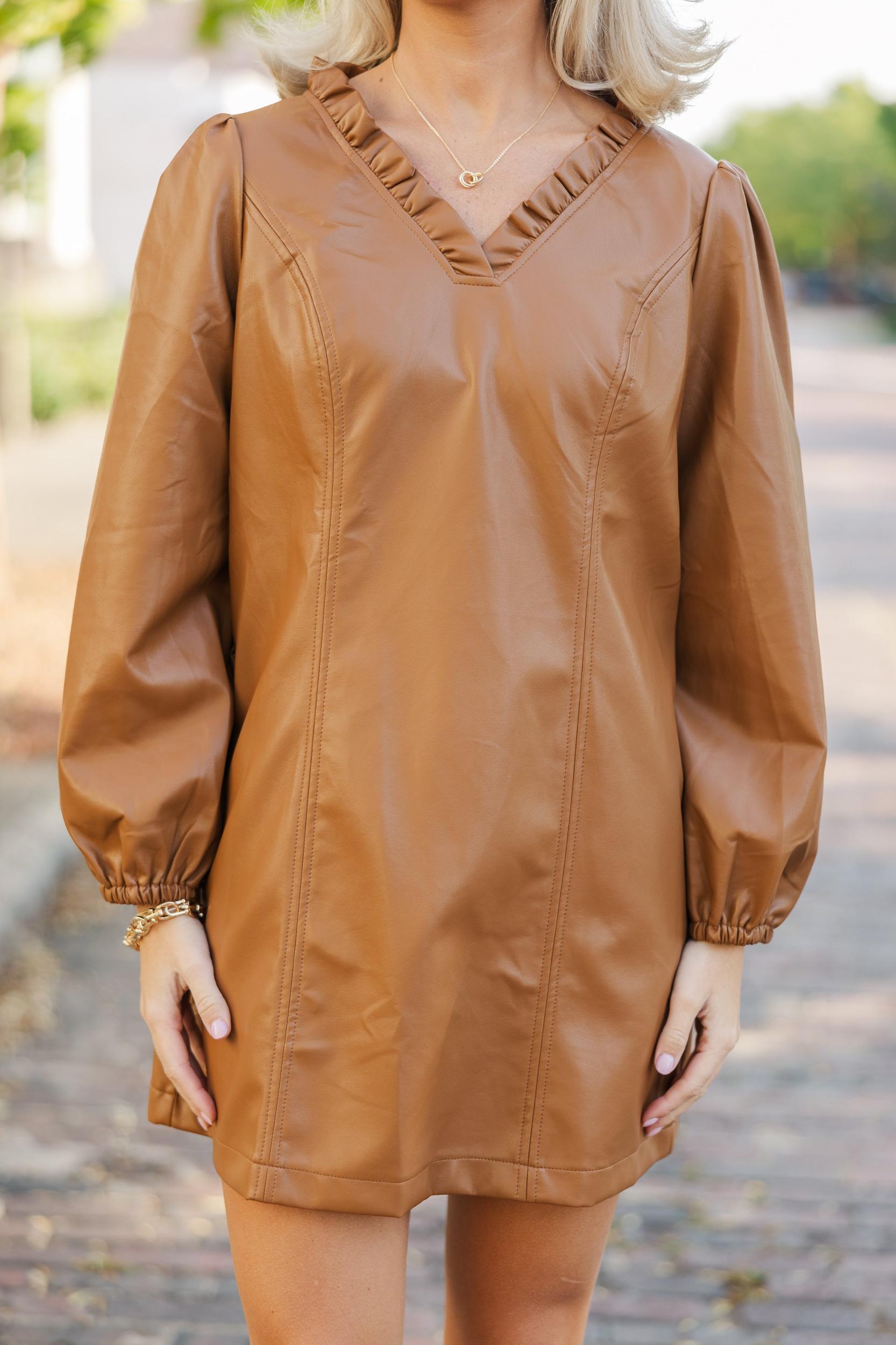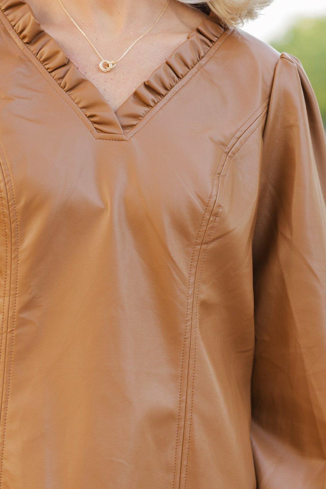Look at you in this fab faux leather dress! That fabric is perfect for the season! Plus, we love a long sleeve dress this time of year! This neutral dress is going to be a fun choice any day of the week! V-neckline Long bubble sleeves Ruffled detailing Faux leather fabric Minimal stretch Payton is wearing the small.