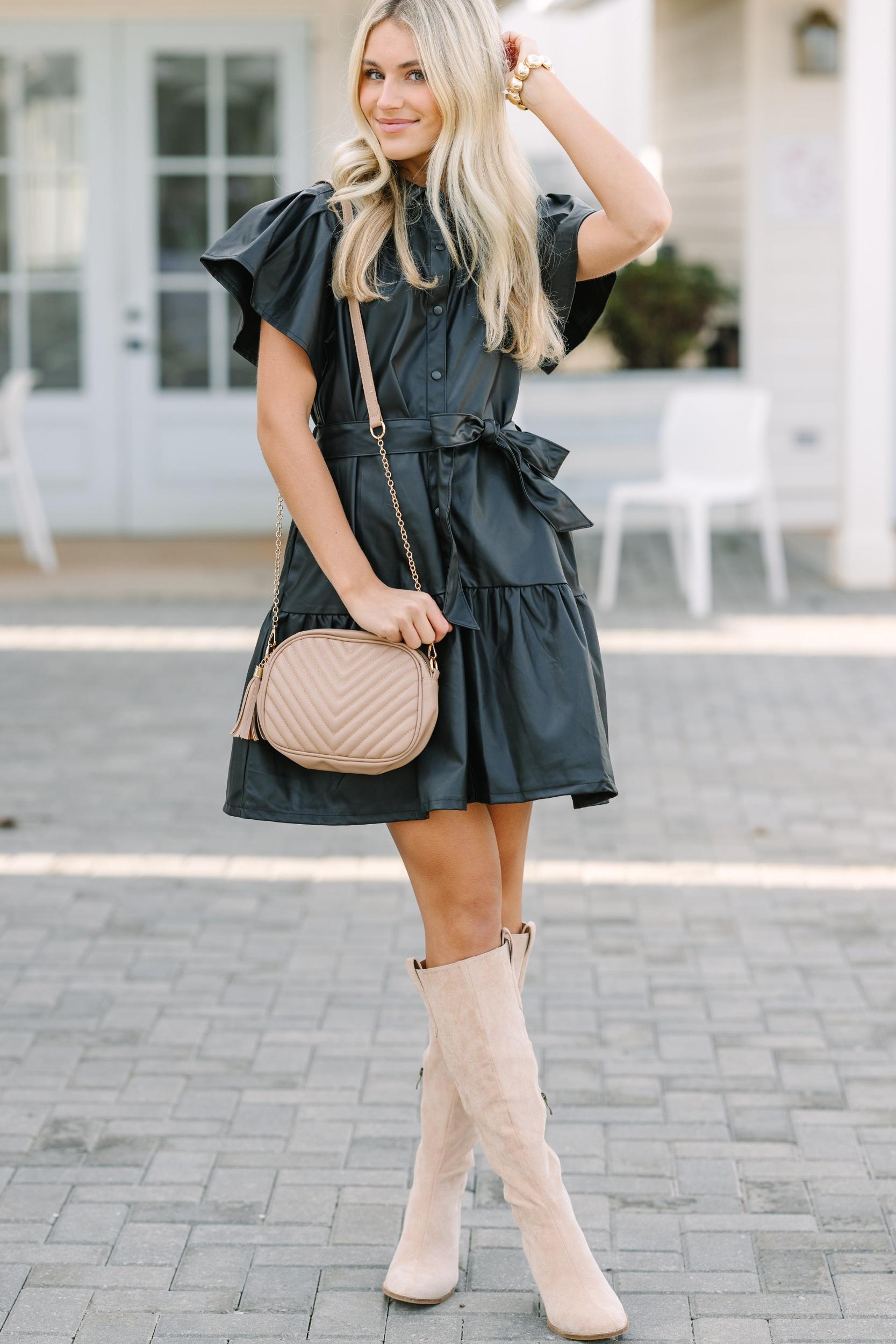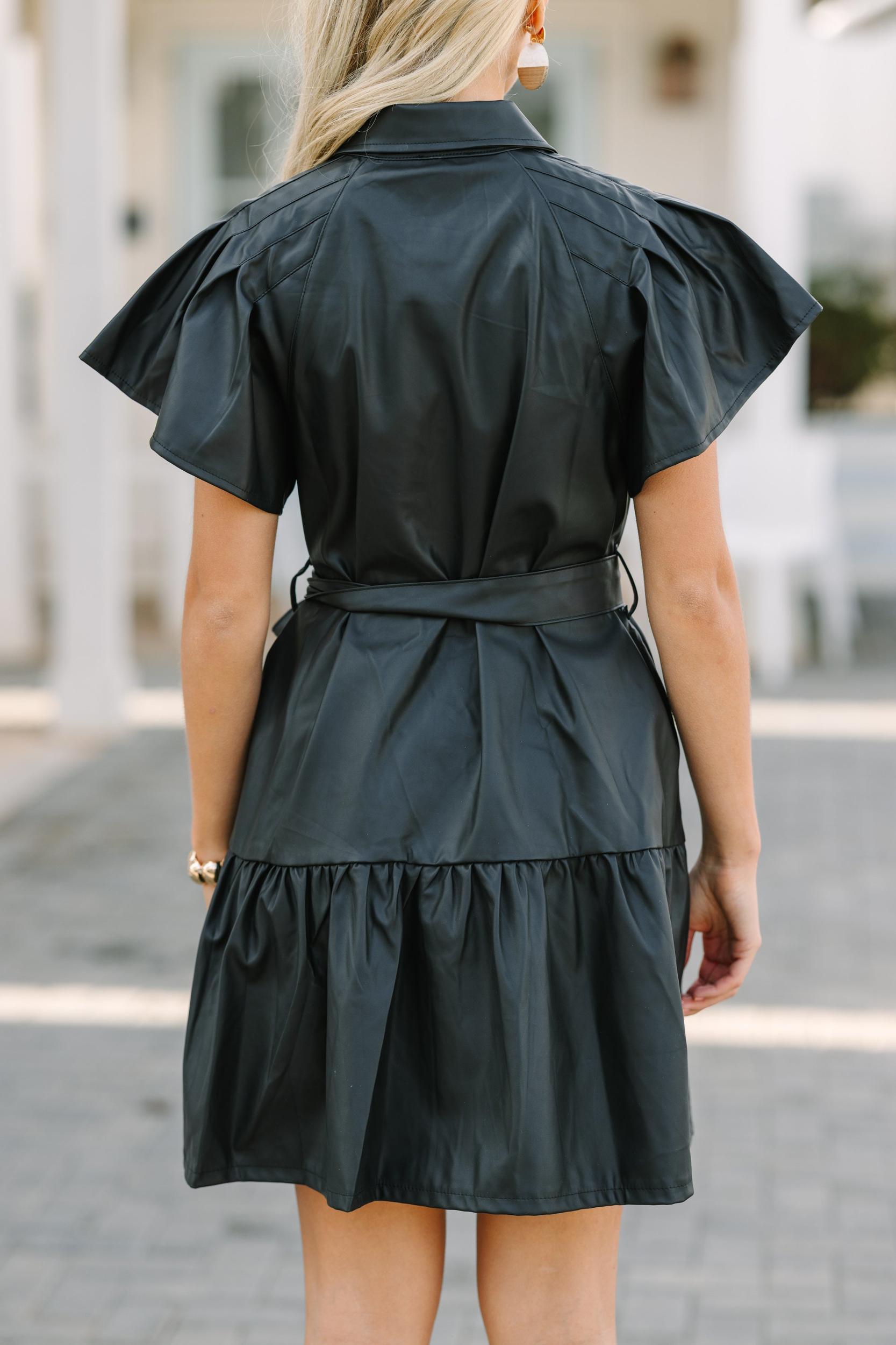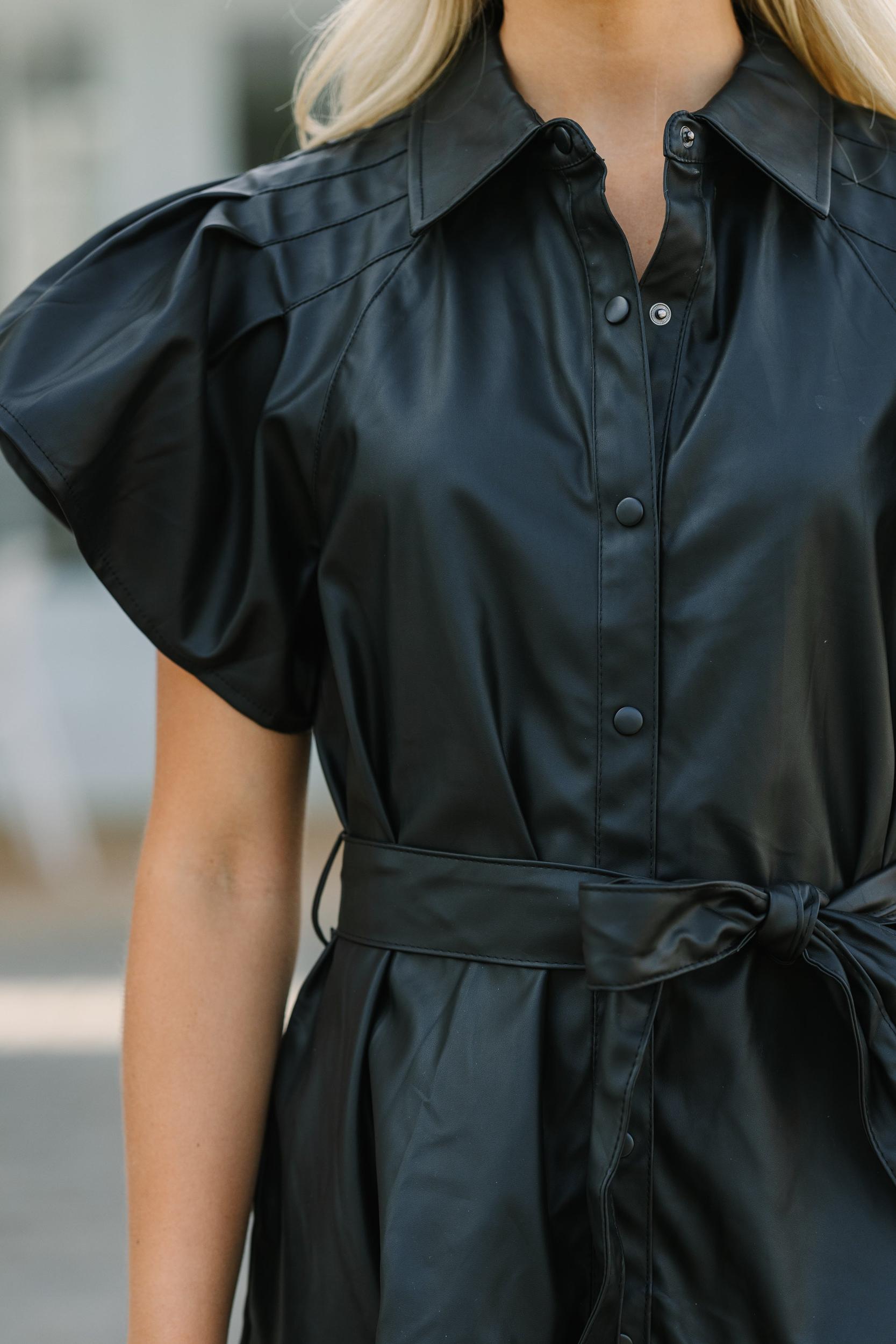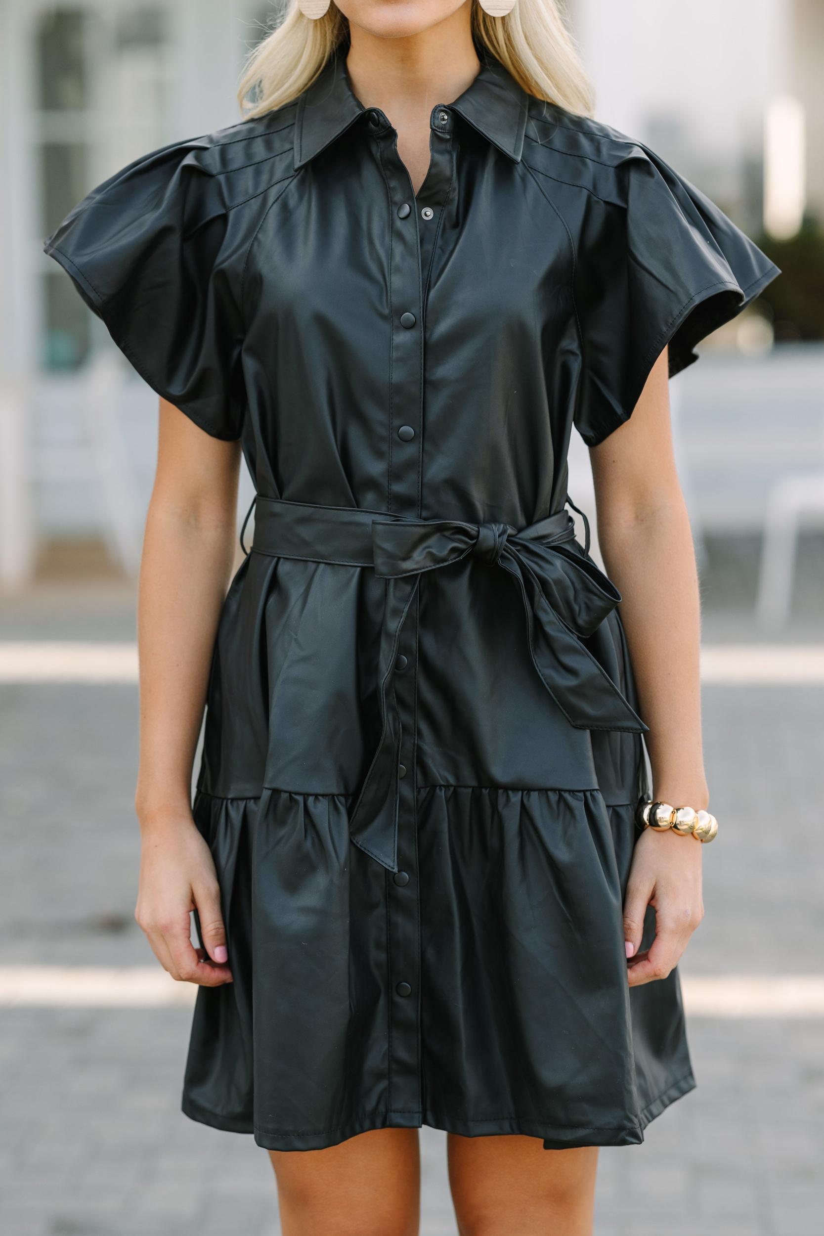 This faux leather dress is so chic and sassy! We love the flattering tied waist and those fluttery sleeves. This button down dress is going to look great for date nights or brunches with the gals. Collared neckline Short flutter sleeves Button down front closure Tied waist Faux leather fabric Minimal stretch Poppy is wearing the small.