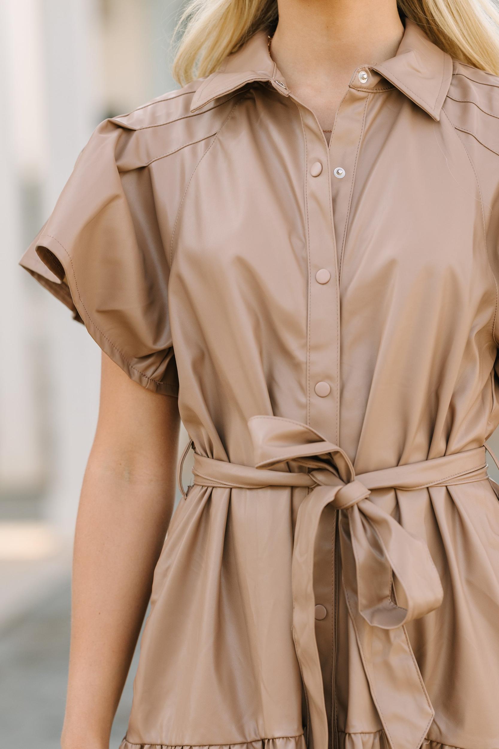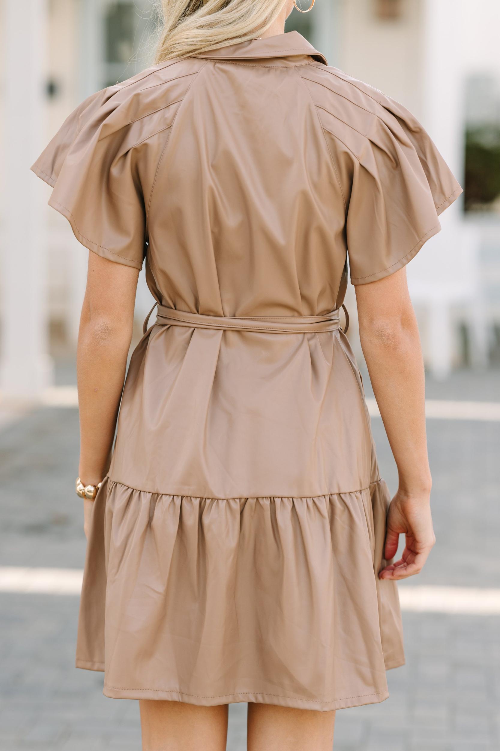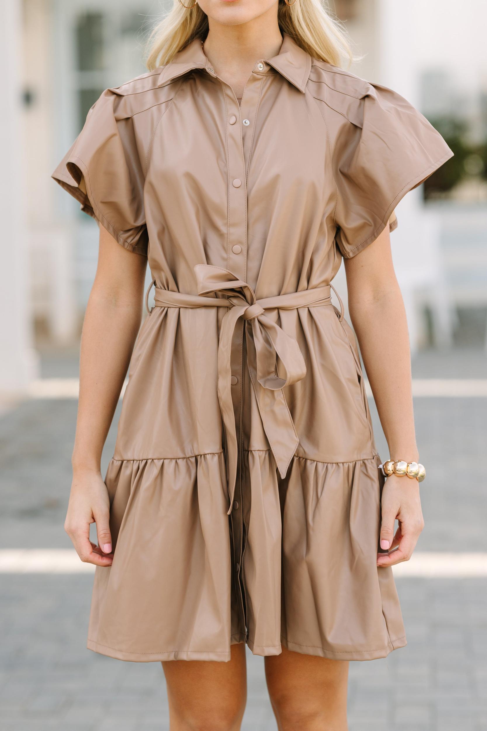 This faux leather dress is so chic and sassy! We love the flattering tied waist and those fluttery sleeves. This button down dress is going to look great for date nights or brunches with the gals. Collared neckline Short flutter sleeves Button down front closure Tied waist Faux leather fabric Minimal stretch Poppy is wearing the small.
