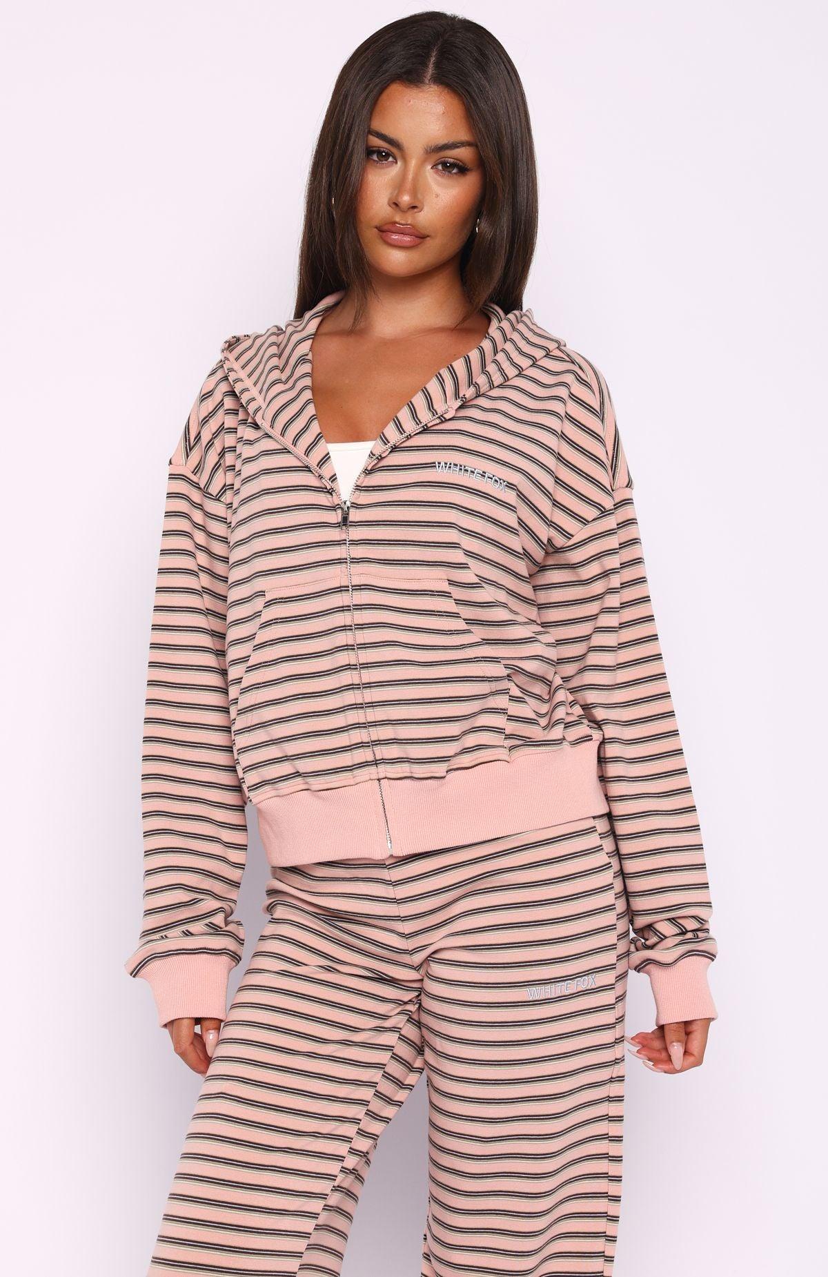Easy looks, easy days. The Looking Back Boxy Zip Front Hoodie Pink Stripe is designed with a relaxed hood, drop shoulder design and ribbed hems which round out to an oversized silhouette. Featuring long sleeves, front zipper closure, a roomy front pocket, and White Fox text that embellishes the side front. Have your matching moment by pairing with the Looking Back Wide Leg Pants. - Hood - Boxy Fit - Long Sleeves - Front Pocket - Ribbed Cuffs - Ribbed Hem Band - Standard Zip