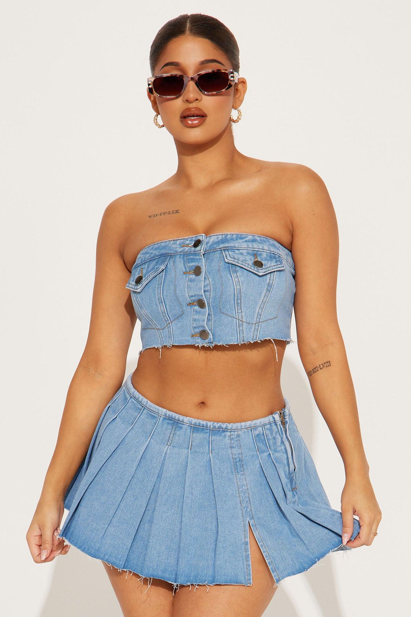 Available In Medium Wash. Denim Skirt Set Tube Top Button Front Smocked Back Micro Mini Skirt Pleated Disclaimer: Due To The Specialized Wash Process, Each Garment Is Unique. 95% Cotton 3% Polyester 2% Rayon Imported California Proposition 65WARNING: Cancer and Reproductive Harm - www.P65Warnings.ca.gov.