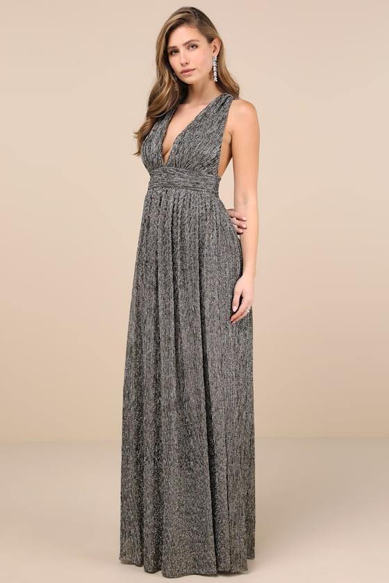 Look like the star that you are in the Lulus Looking Radiant Black and Gold Metallic Maxi Dress! Sheer woven fabric, with metallic black and gold threading, sparkles over a knit lining as it shapes a plunging triangle bodice with a banded empire waist and full maxi skirt. Twisted back straps and exposed gold zipper.