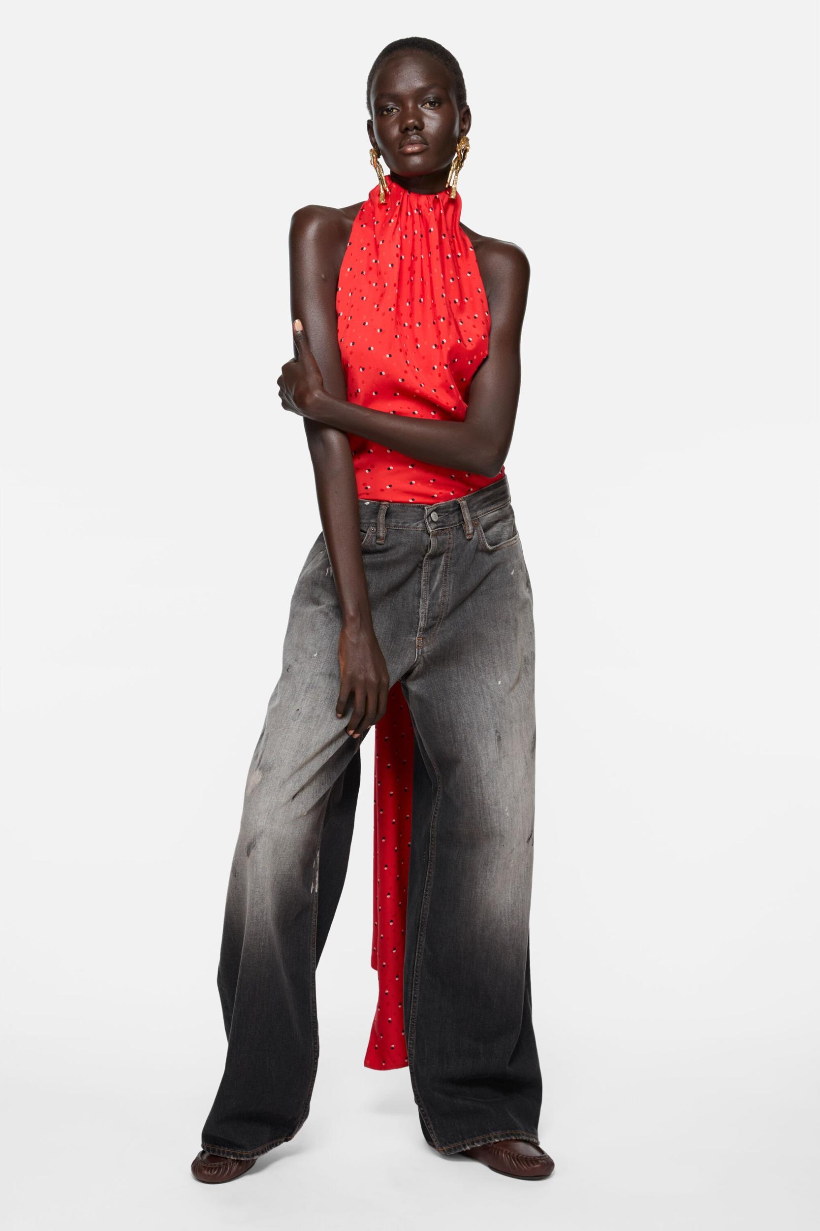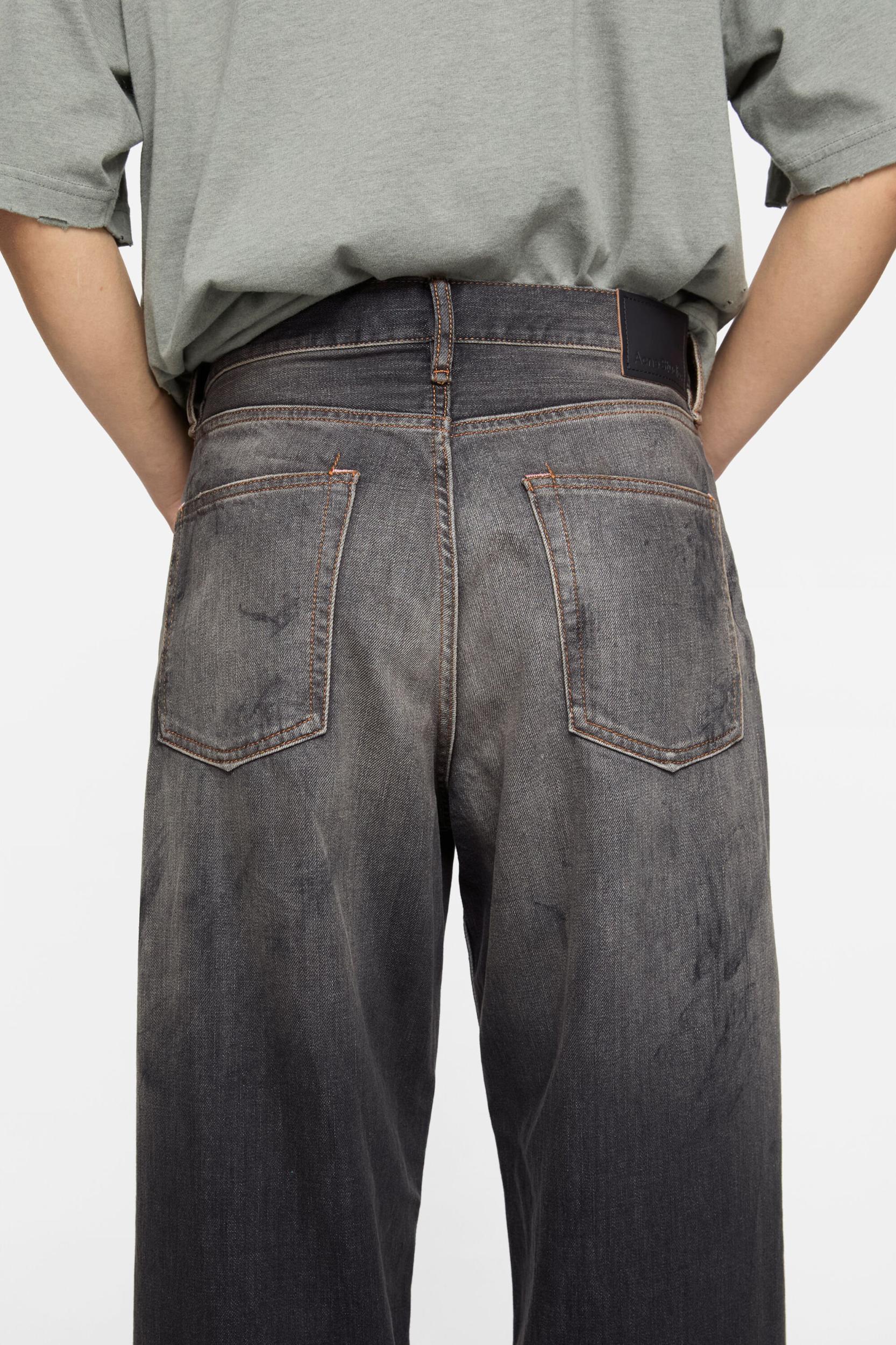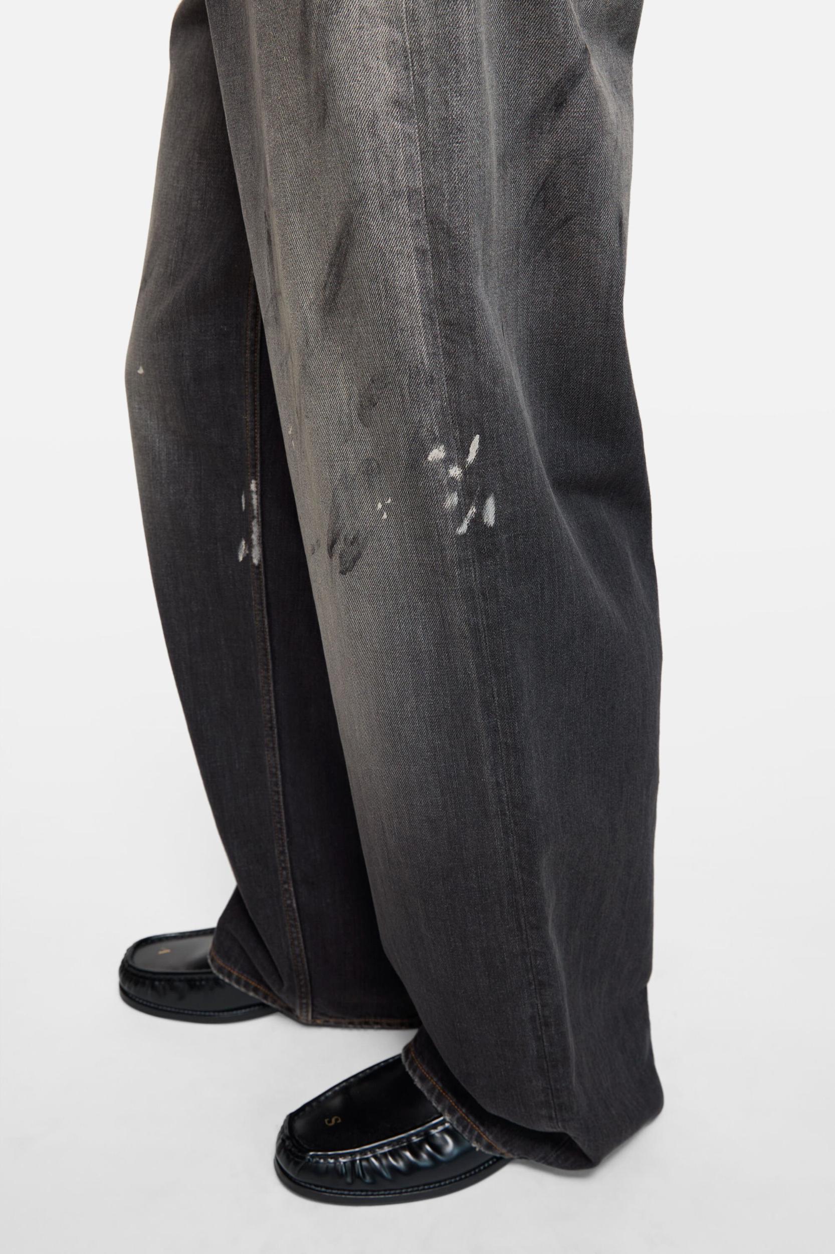 1981 jeans are cut to a loose fit with a mid-rise waist, wide baggy legs, and a long length. Featuring a dark wash on slubby black denim with extreme contrast, a dirty tint, and hand-applied dirt and paint marks. Acne Studios 1981 U Black Trafalgar