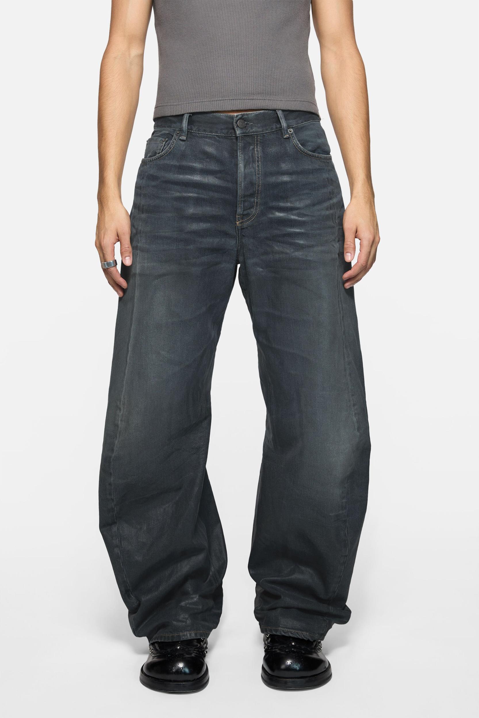 2006 jeans are crafted from dark ring denim with a shiny black coated finish, featuring 3D whiskers and creases. The glossy coating fades toward the waistband to reveal the denim base. Cut to a loose fit with a low waist and wide leg. Acne Studios 2006F Glossy