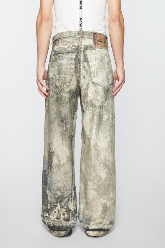 1981 trousers are cut to a loose fit with a low waist, wide leg and long length. Made of cotton canvas fabric base with a seasonal trompe l'oeil optical illusion 'splatter' print with an ink jet pigment and a dirty mineral tint. FN-MN-TROU000959