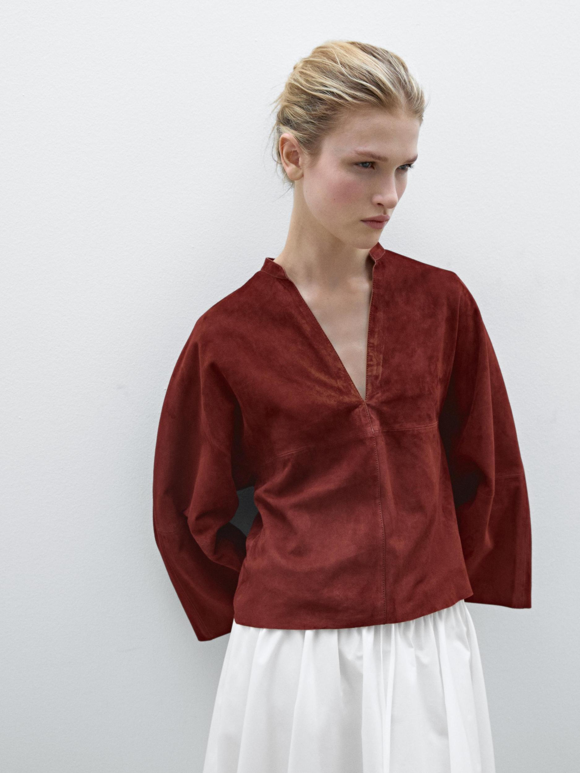 Shirt made of sheepskin with a suede finish, Stand-up collar with V-neck, Wide long sleeve, Soft fabric that’s pleasant to the touch , Wide and relaxed silhouette, not tailored