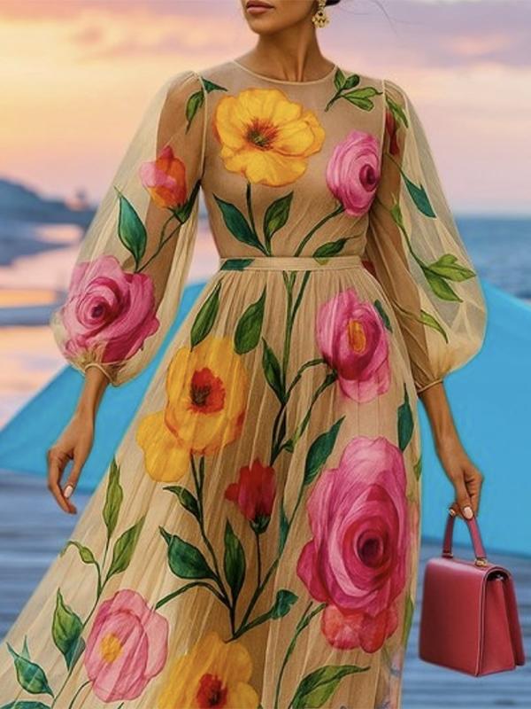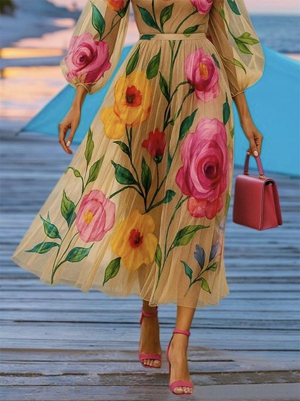 Explore this elegant loose puff sleeve midi dress with delicate floral print and sheer round neckline. A perfect blend of femininity and modern style for the fashion-forward woman. Buy now to enjoy high quality and swift shipping on this latest European-inspired design!