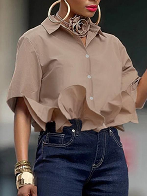 Add charm to your wardrobe with this loose-fit ruffled lapel blouse. Designed with soft split-joint detailing and airy short sleeves, it’s perfect for both casual and chic looks. Embrace effortless elegance in this must-have Western fashion top — new arrival with fast shipping!