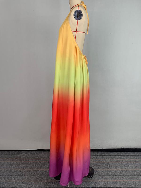 Loose Sleeveless Backless Contrast Color Pleated Split-Joint Tied Spaghetti-Neck Maxi Dresses