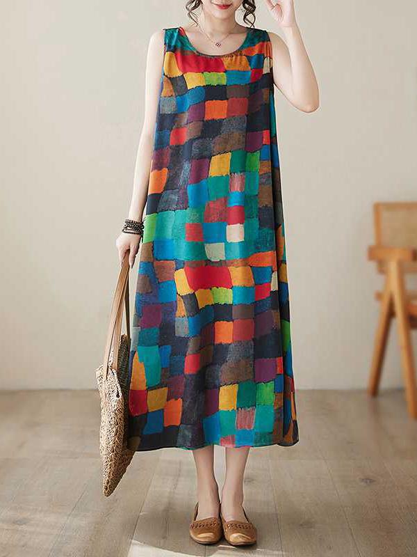 Loose Sleeveless Contrast Color Multi-Colored Plaid Round-Neck Midi Dresses