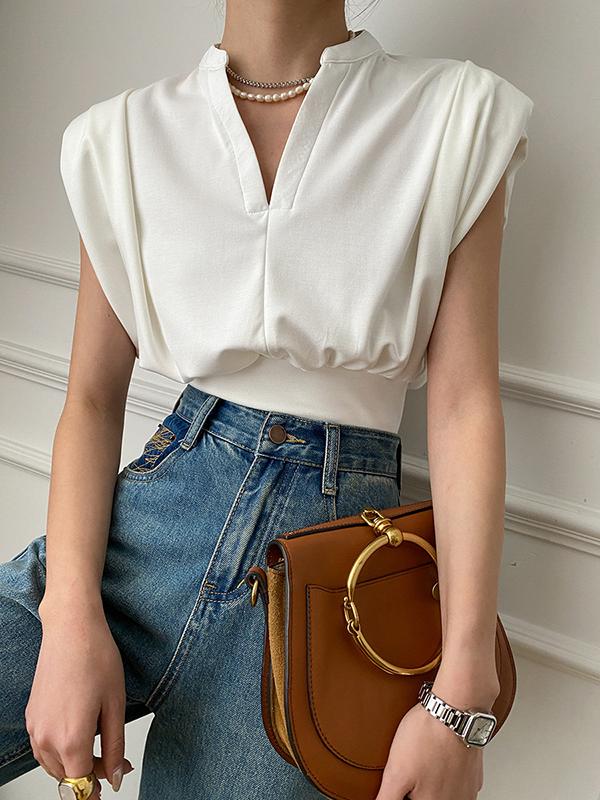 Loose Sleeveless Pleated Shoulder Pad Solid Color V-Neck T-Shirts Tops