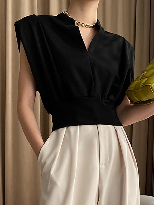 Step into elegance with our sleeveless V-neck tops featuring pleated shoulder pads for a touch of sophistication. Perfect for adding refinement to your ensemble.