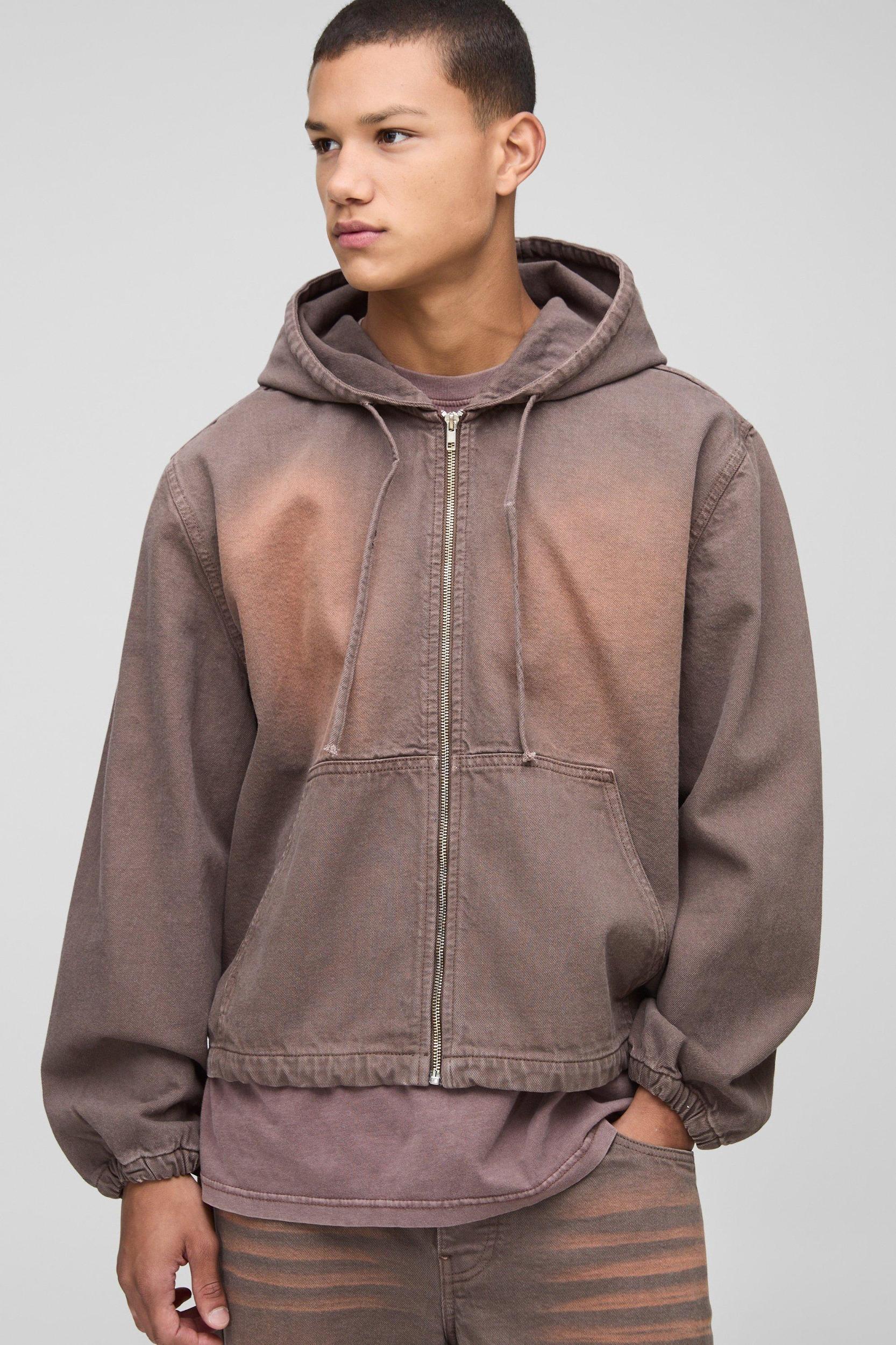 Loose Washed Brown Denim Hoodie | boohooMAN USA