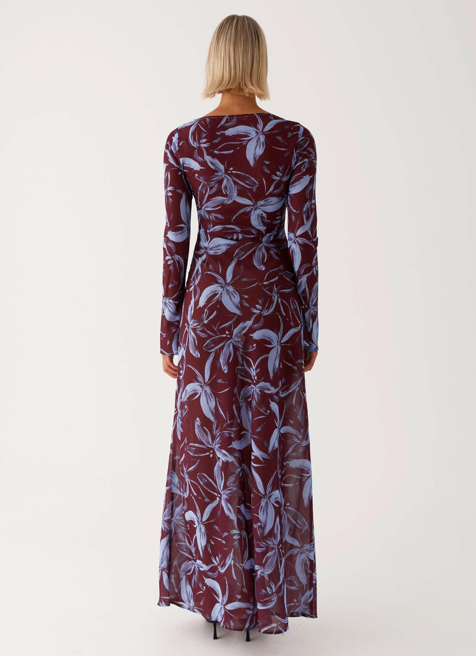Peppermayo Exclusive Introducing the Lorde Maxi Dress. This design showcases a high rounded neckline and long sleeves in a semi-sheer fabric, blending sophistication with a touch of allure. Perfect for making a graceful entrance at any evening event. - Maxi Length- High Rounded Neckline- Exclusive Print (Print Placement Will Differ Per Garment)- Long Sleeves- Semi Sheer- Unlined- Side Invisible Zipper- 100% Polyester Size AU 8 / US 4 garment measurements: Bust: 76 cm / 29.9 inWaist: 68 cm / 26.8 inSleeve Length: 69 cm / 27.2 inLength: 150 cm / 59.1 in Annalise is 176cm and wearing a size AU 8 / and US 4