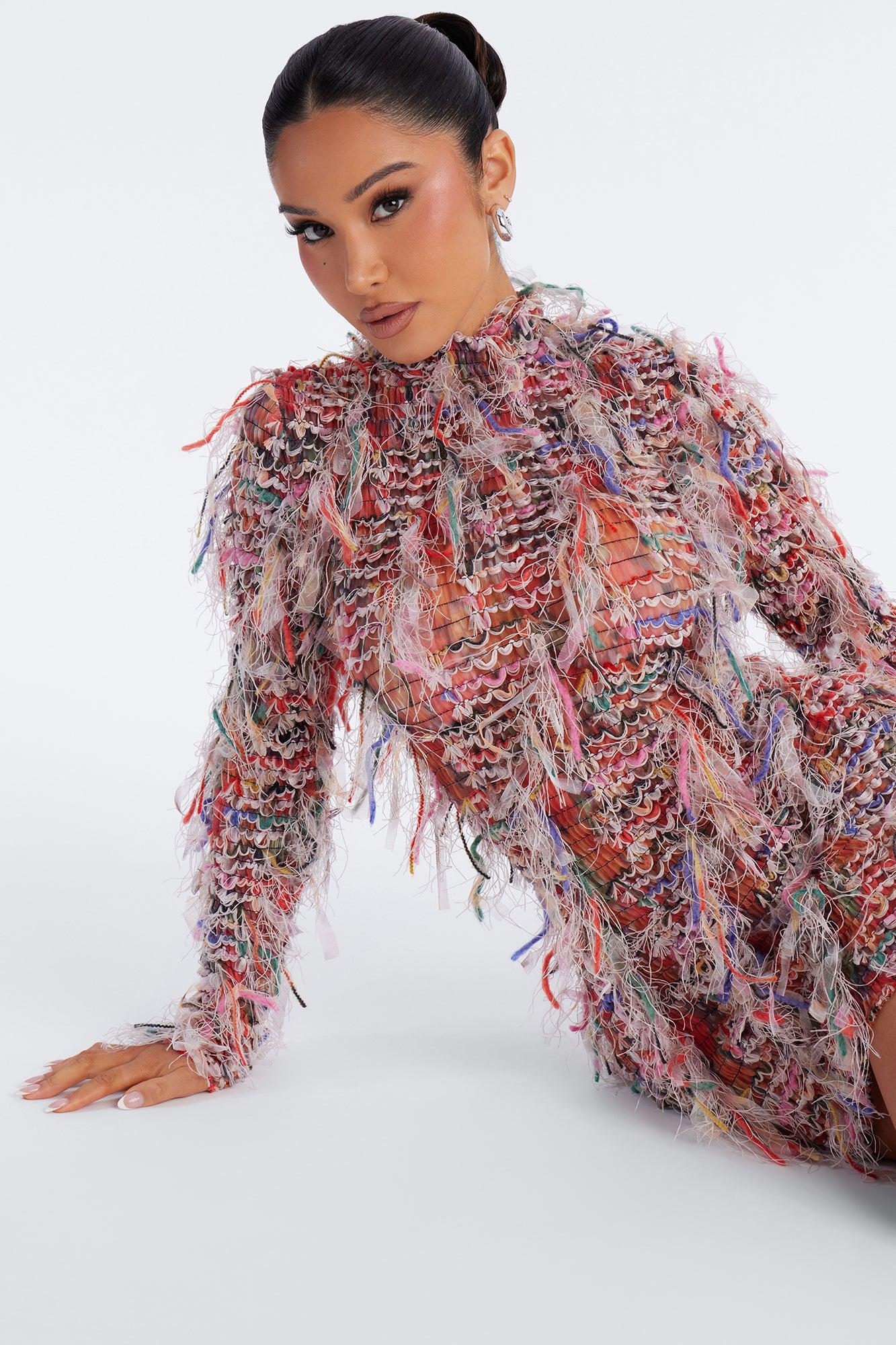 Available In Multi Color. Mesh Mini Dress Mock Neck Long Sleeve Fringe Stretch Length Measured Flat = 32" Self: 40% Polyester 60% Spandex Imported