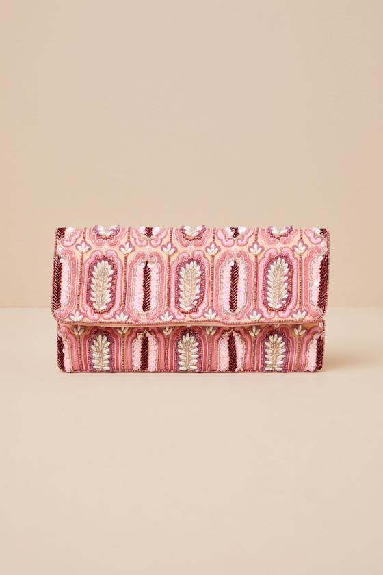 A colorful array of beads and sequins creates a leaf-inspired design across this rectangular clutch that is ready to add the perfect pop of color to any of your favorite looks. The front flap boasts a hidden magnetic closure that lifts to reveal a roomy interior with a sidewall pocket and a detachable crossbody chain.