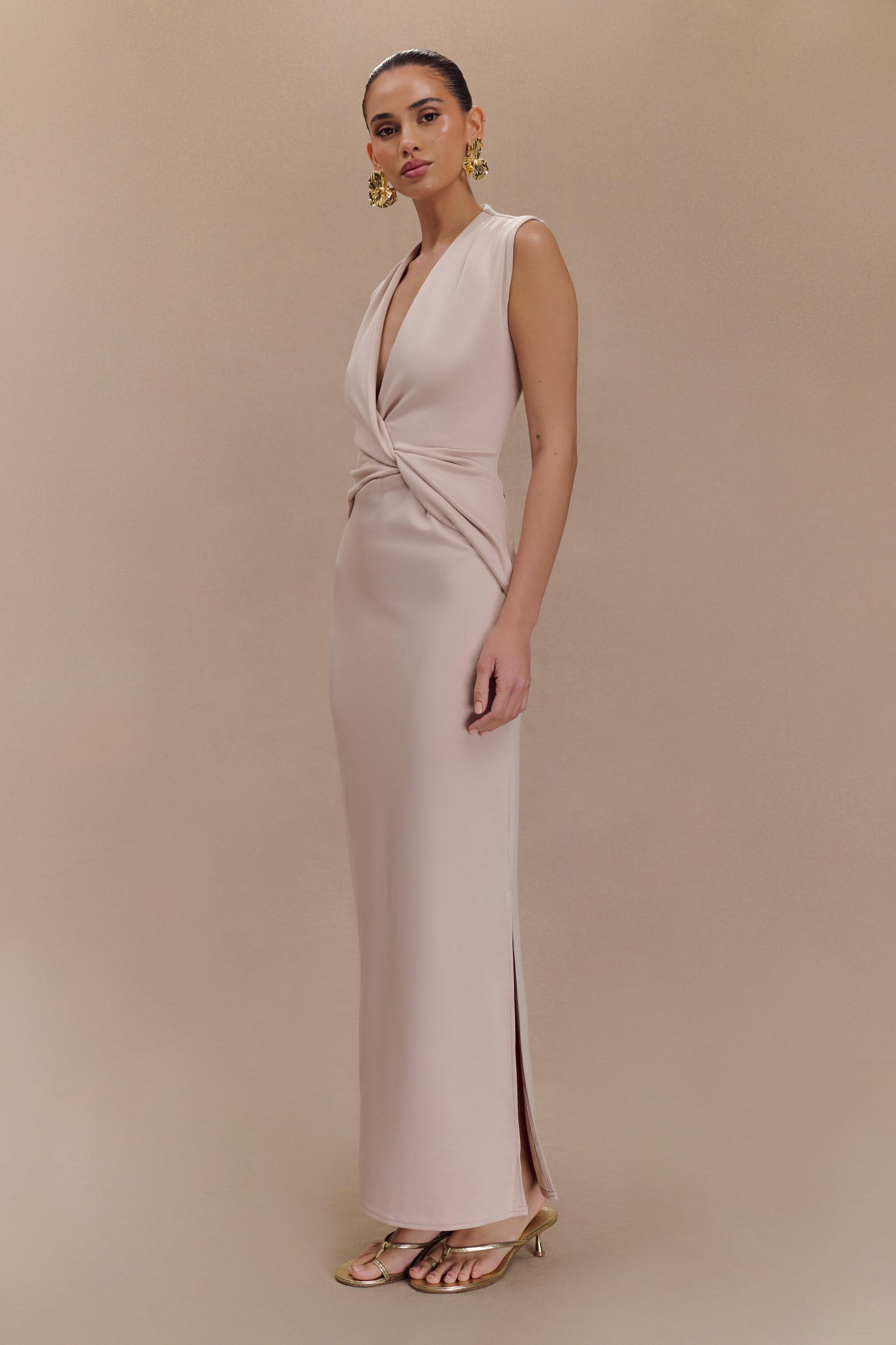 Stylish twist. Meet the LORELEI Twist Midi Dress, a perfect blend of sophistication and modern style. Featuring a flattering V neckline and sleeveless design, this dress showcases an eye-catching twist front detail that enhances your silhouette. With its chic midi length, it’s versatile enough for any occasion. Pair it with strappy heels for a polished look or sandals for a casual vibe. This dress is your must-have staple for refined elegance.