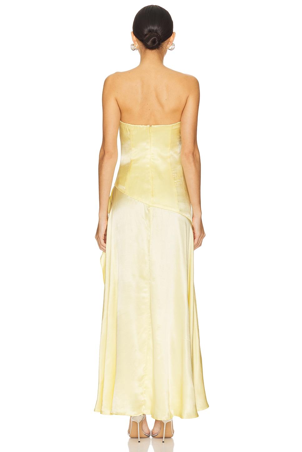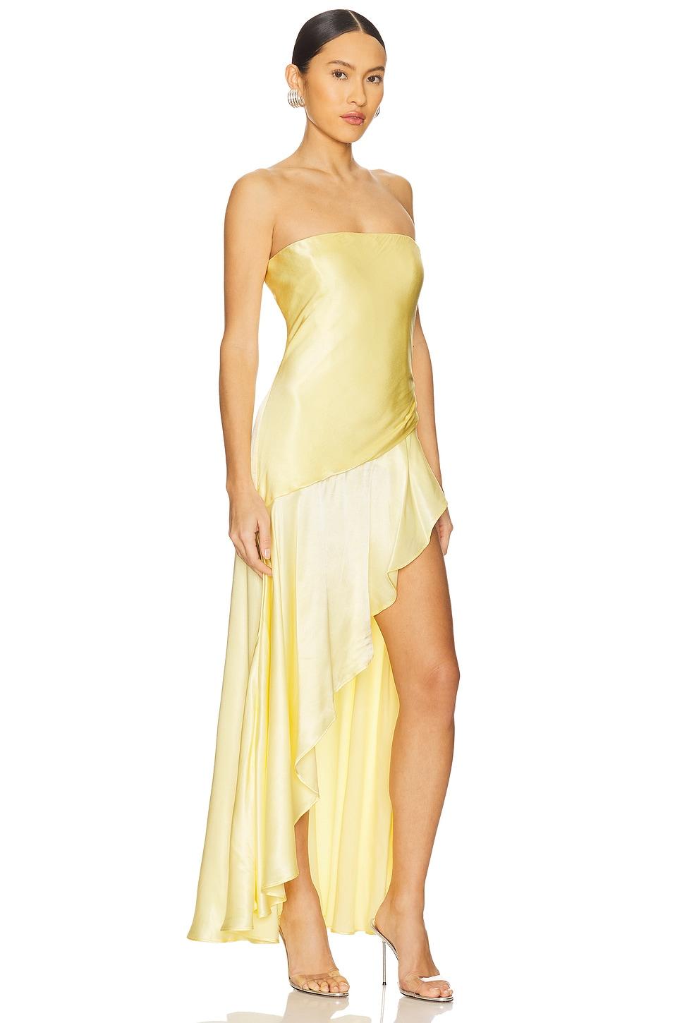 Self: 100% viscoseLining: 100% polyester. Hand wash. Partially lined. Hidden back zip closure. Boned bodice. Asymmetrical hem. Midweight sateen fabric. Neckline to shortest hem measures approx 18" and to longest hem approx 49" in length. Made in China. Revolve Style No. BARD-WD938. Manufacturer Style No. 59266DB.