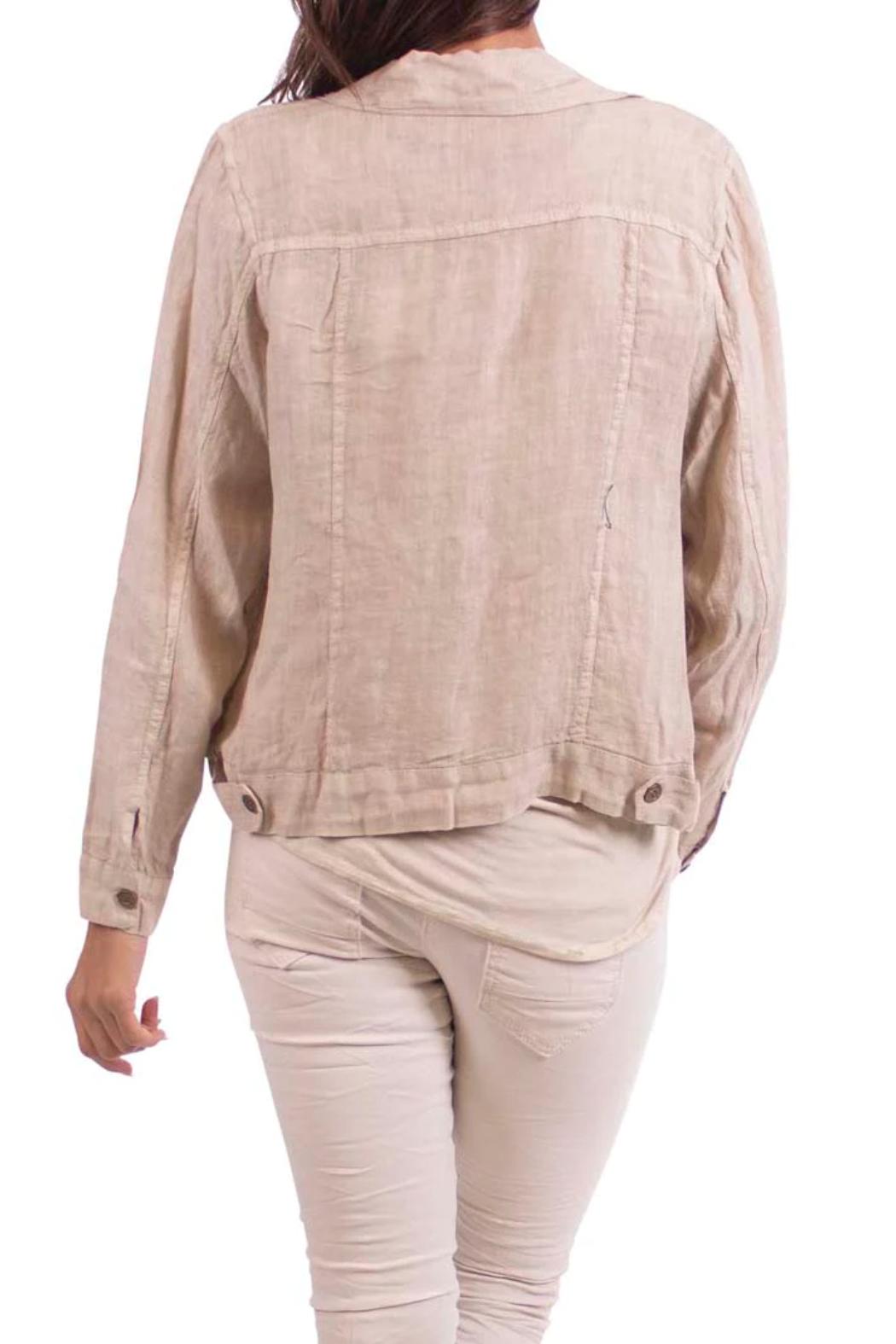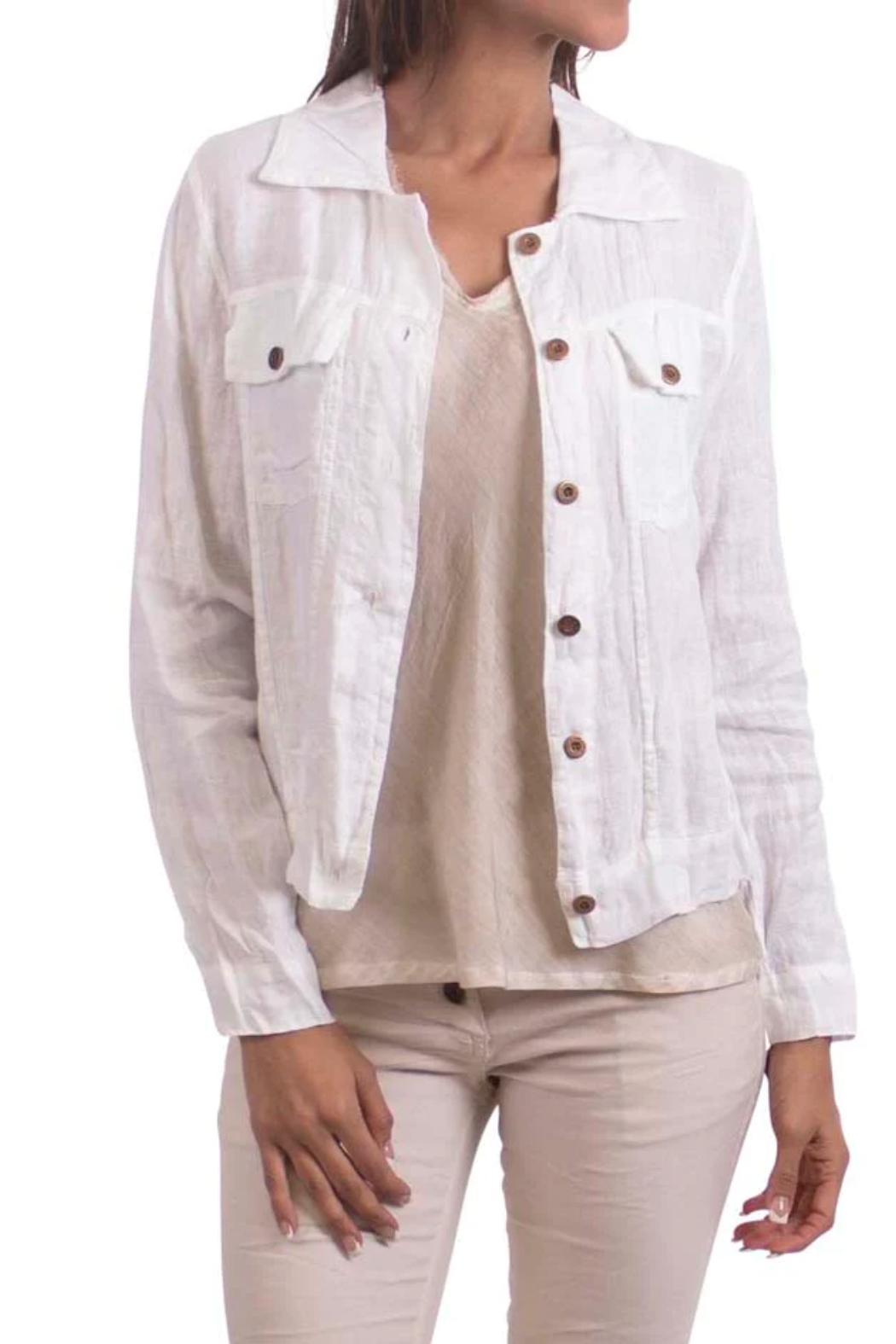 Pure linen jean style jacket with button-up front. 2 chest-height front pockets with buttons. Full-length sleeves with button closure. 100% Linen Model is 5'8" Made in Italy Available in Small * Medium * Large