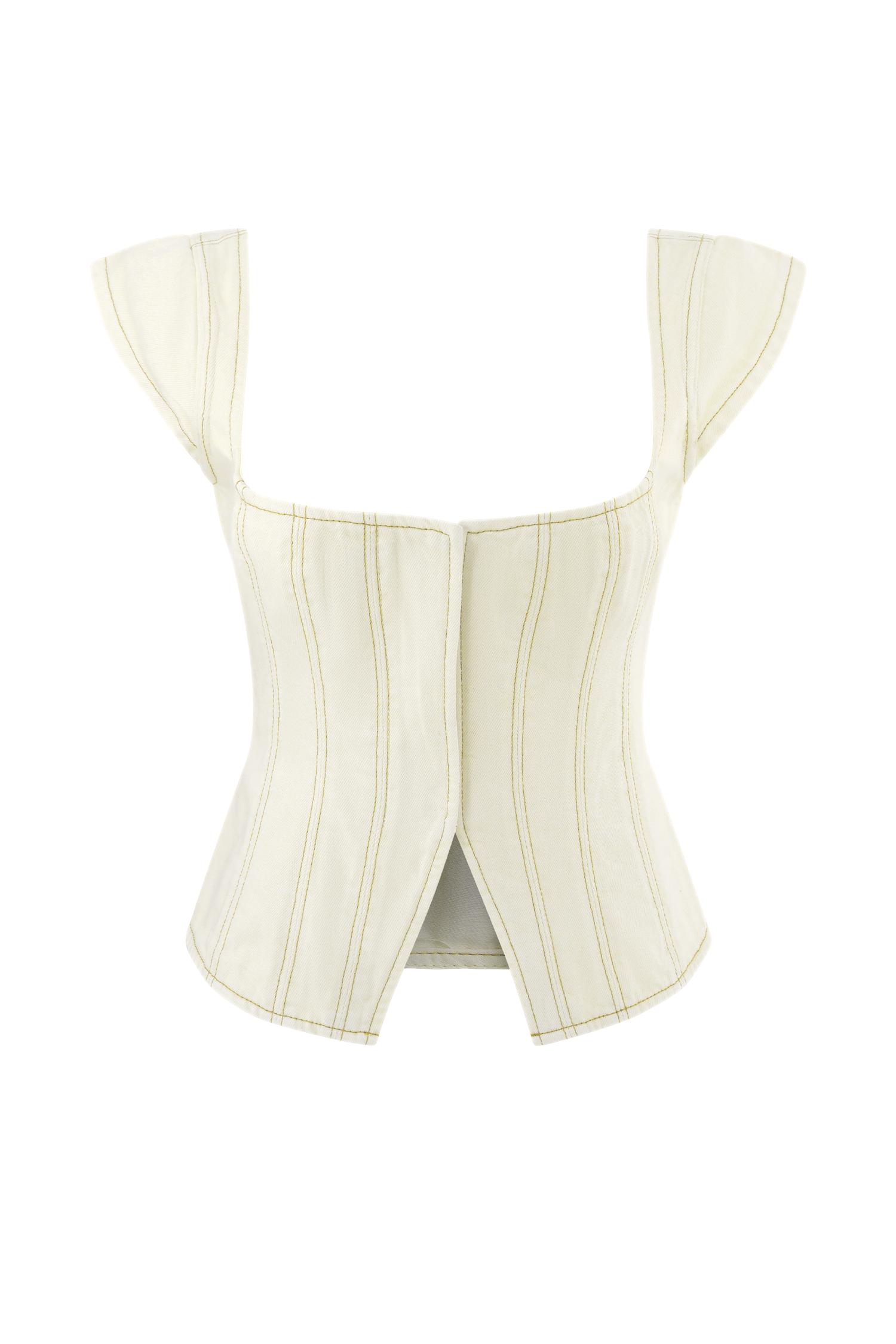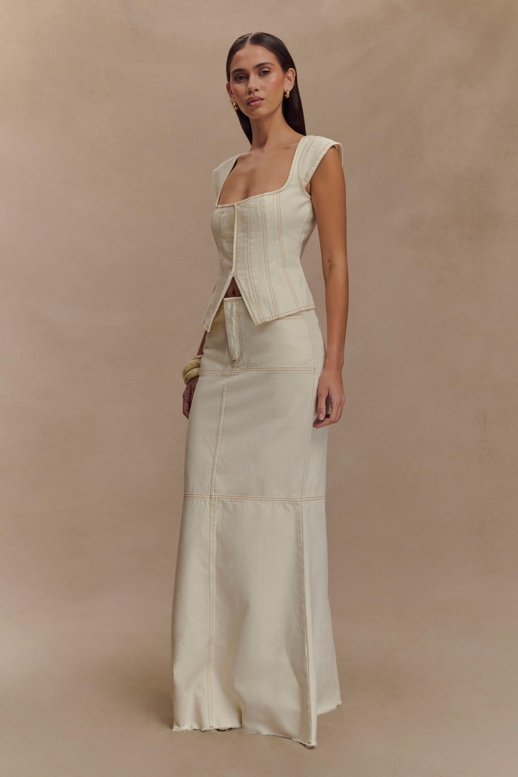 Sculpted denim, soft attitude. Sculpted and statement-making, the LORETTA Cap Sleeve Denim Top brings a fresh edge to everyday dressing. Featuring a structured square neckline and cap sleeves, this longline silhouette flatters with its flared hem and sculpted panel seams. A centre front opening with hook-and-eye closures adds a touch of vintage charm, while the structured denim fabrication holds its shape beautifully. Pair with the Loretta Denim Maxi Skirt for a coordinated look that redefines modern denim.
