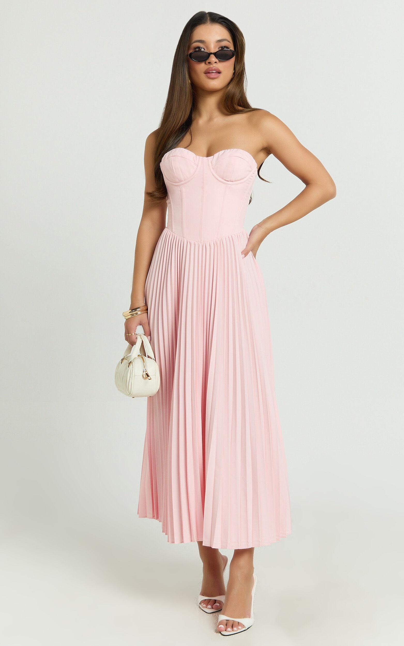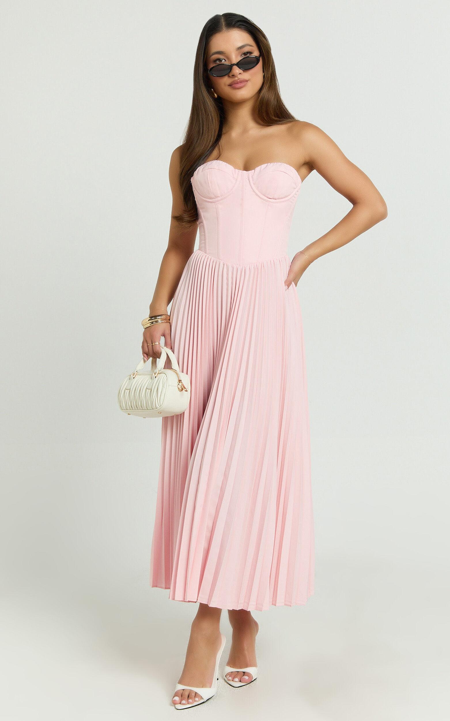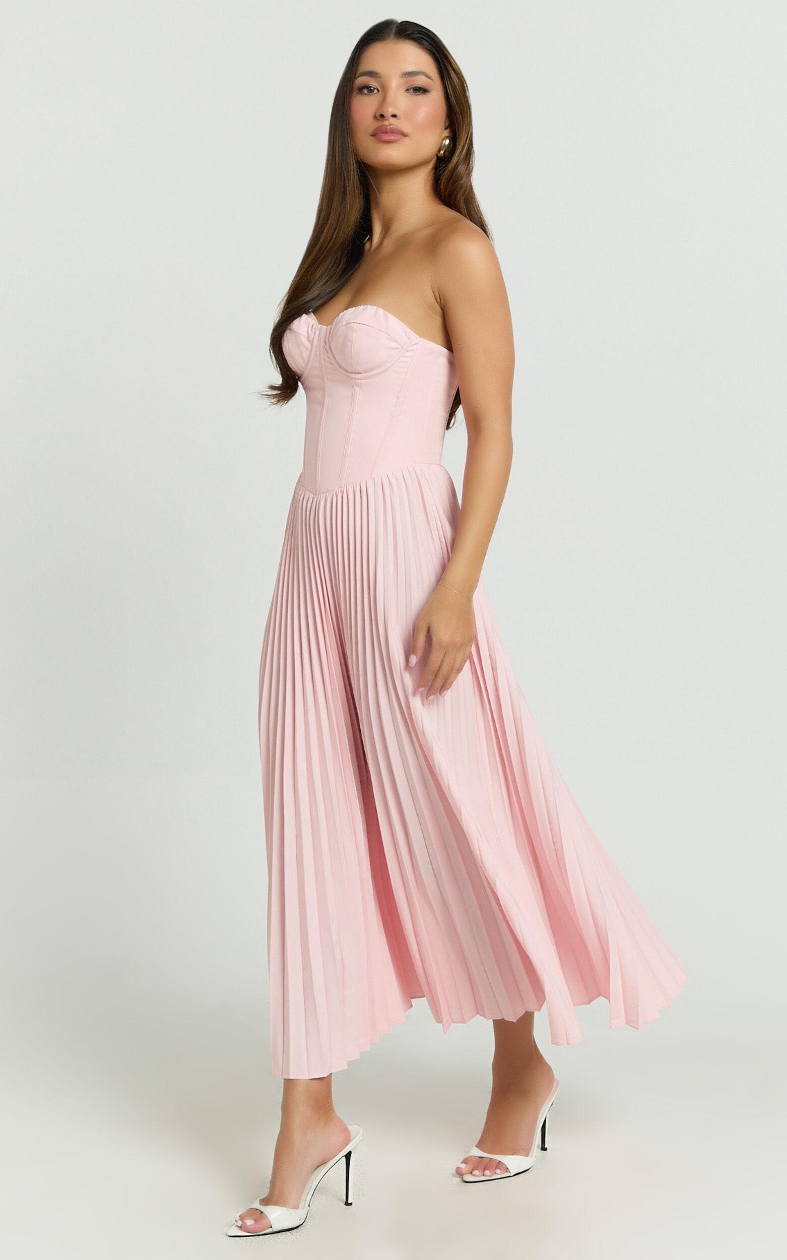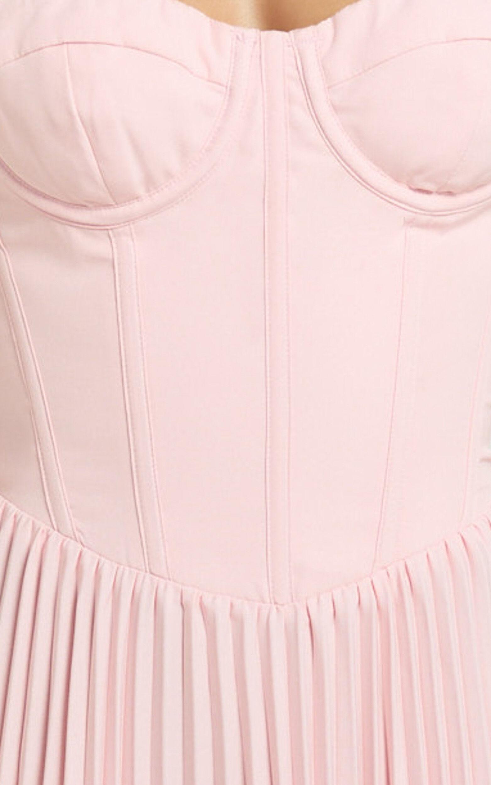 Loretta Midi Dress - Lace Up Back Bustier Pleated Dress in Soft Pink