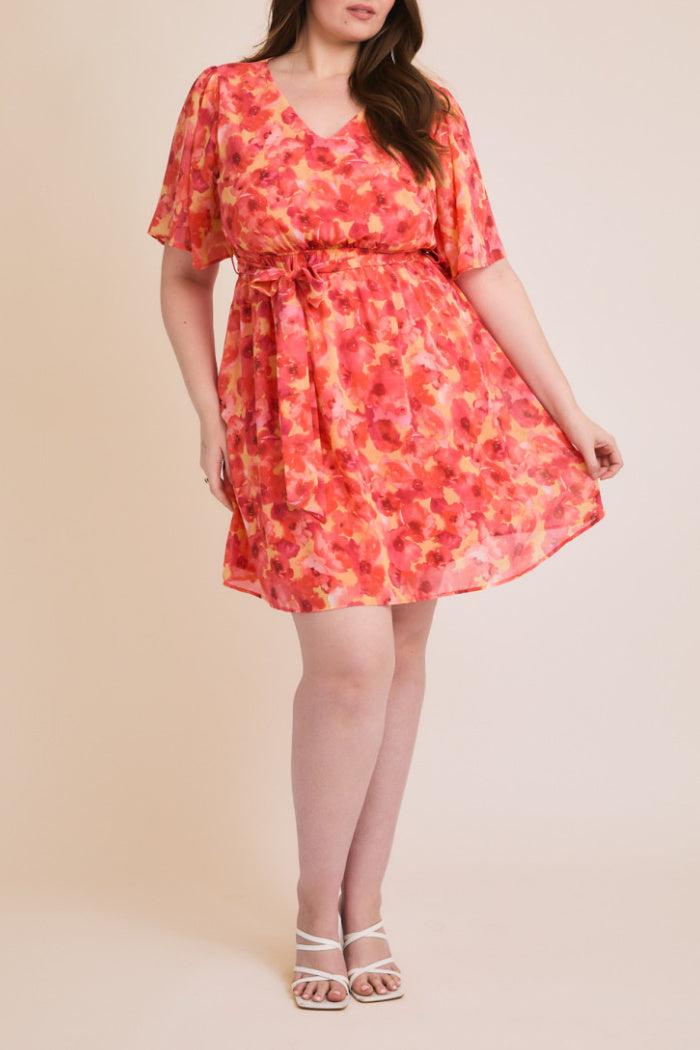 Beautiful, floral print dress with short flutter sleeve, v-neckline, elastic waist and tie belt. Lined. Model is wearing a 1X. Refer to measurements for your perfect fit.