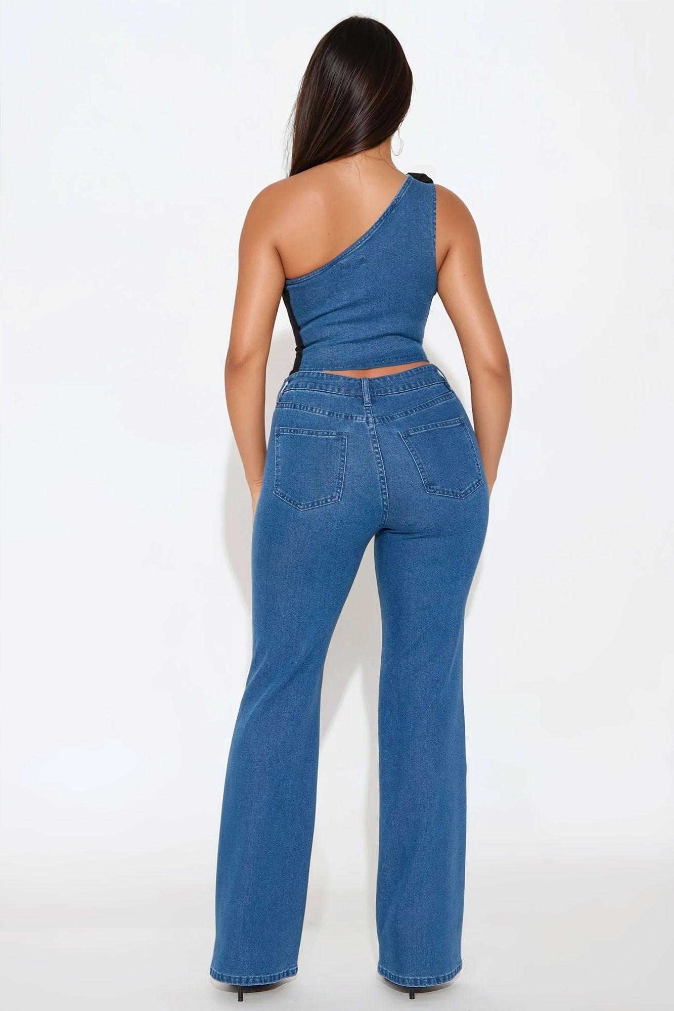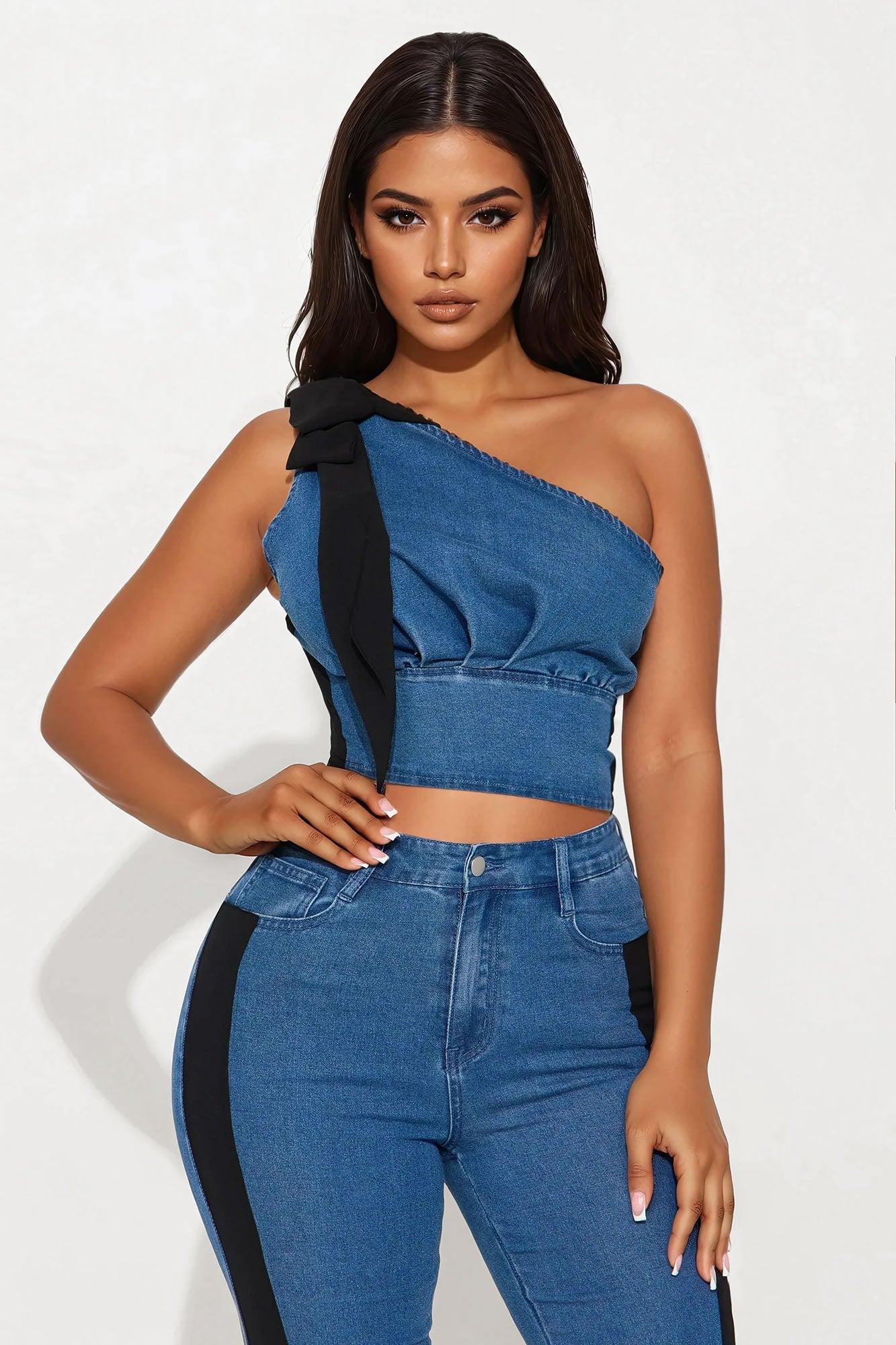 Lorrie One Shoulder Denim Pant Set - Denim