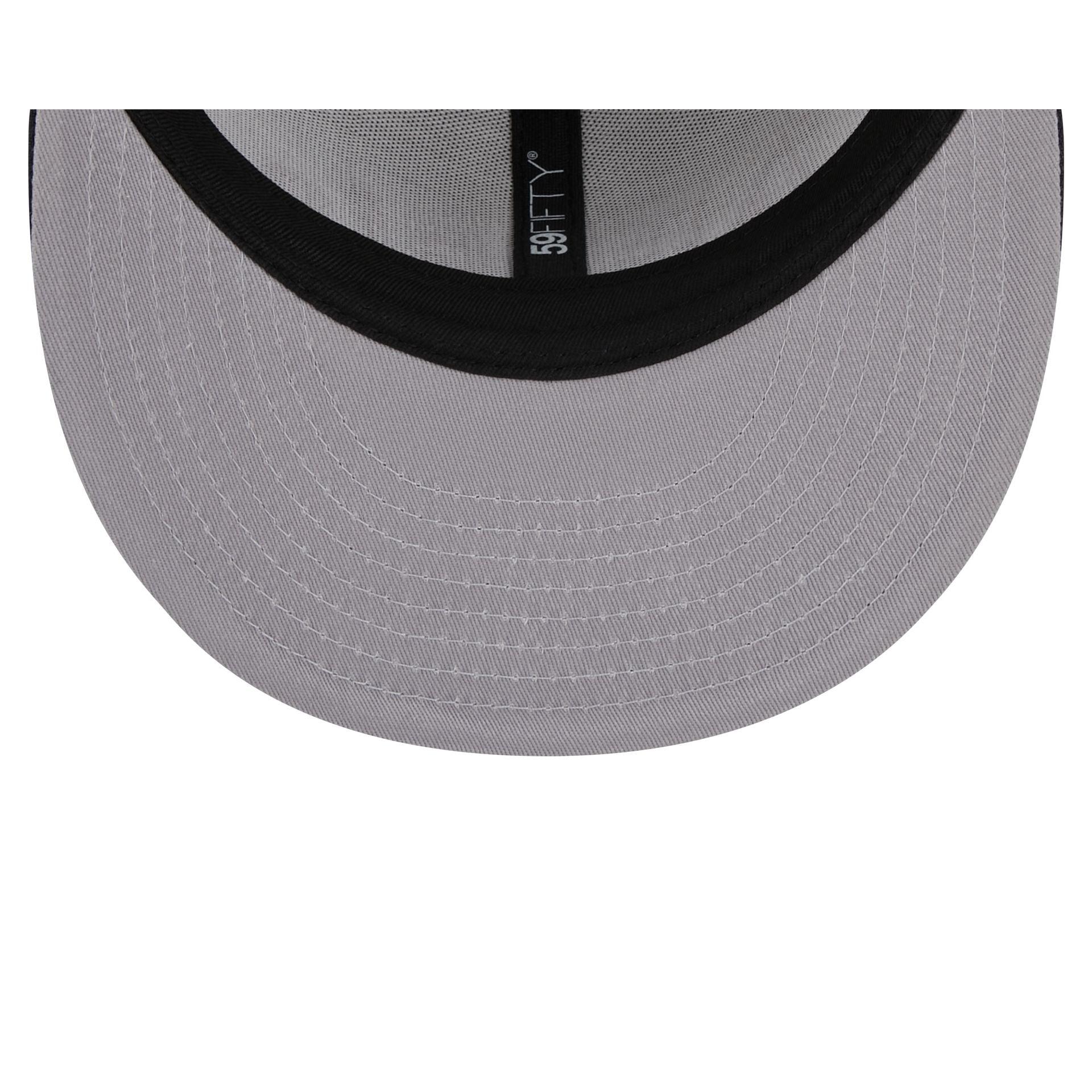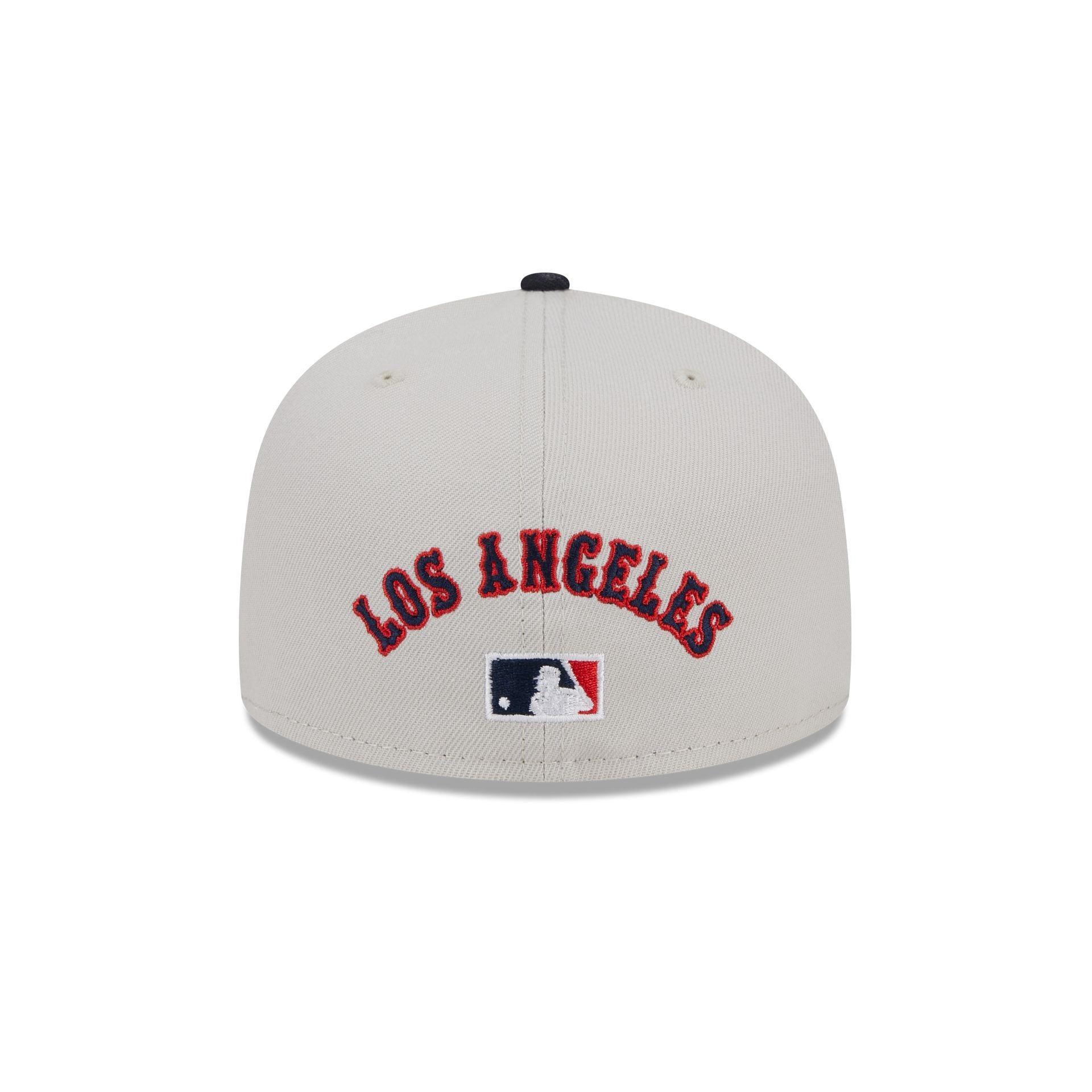 The Los Angeles Angels Coop Logo Select 59FIFTY Fitted Cap features an embroidered Angels wordmark at the front panels with a matching alternate team wordmark above a Cooperstown MLB Batterman logo at the rear. Additional details include a 25h Anniversary patch at the right-wear side, a navy visor, and a gray undervisor.