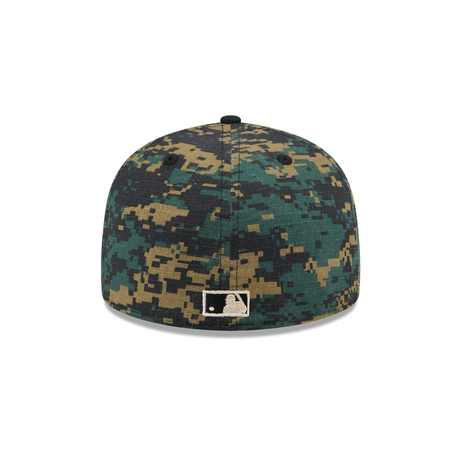 The Los Angeles Angels Digi Camo 59FIFTY Fitted Cap features an embroidered Angels Cooperstown logo at the front panels with a matching MLB Batterman logo at the rear. Additional details include a digi camo rear, a 40th Anniversary patch at the right-wear side, and a gray undervisor.