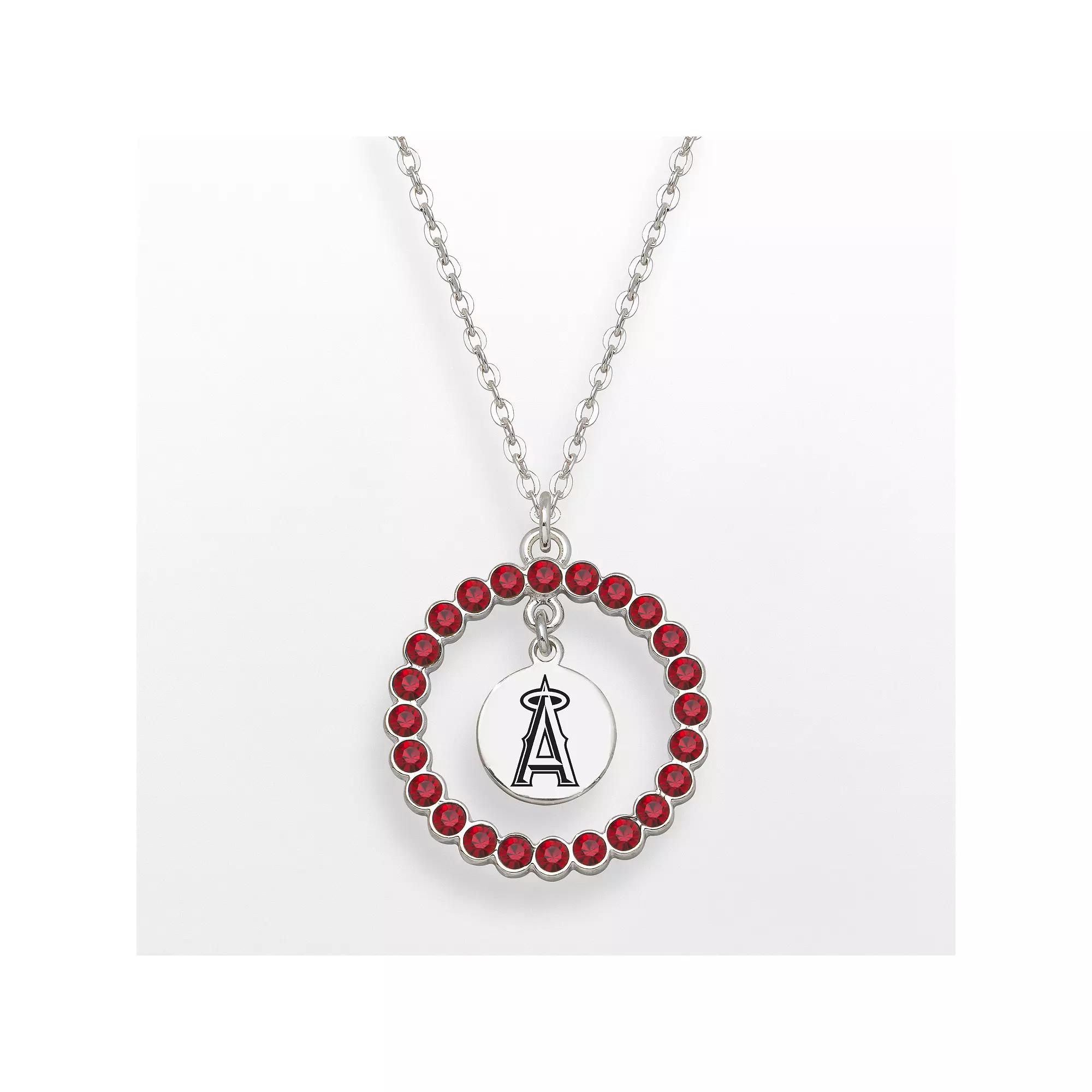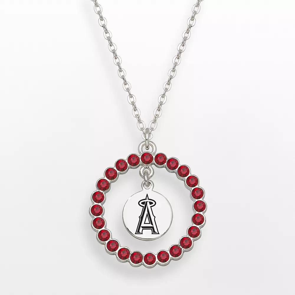 Pendant Details: Pendant length: .56-in. Chain length: 18-in. Clasp: spring-ring Metal: silver tone Features: circle design, dangling logo charm with black enamel Model no. ANG067N-CR Crystal Details: Cut: round Color: red Setting: bezel Size: 18". Gender: female. Age Group: adult.