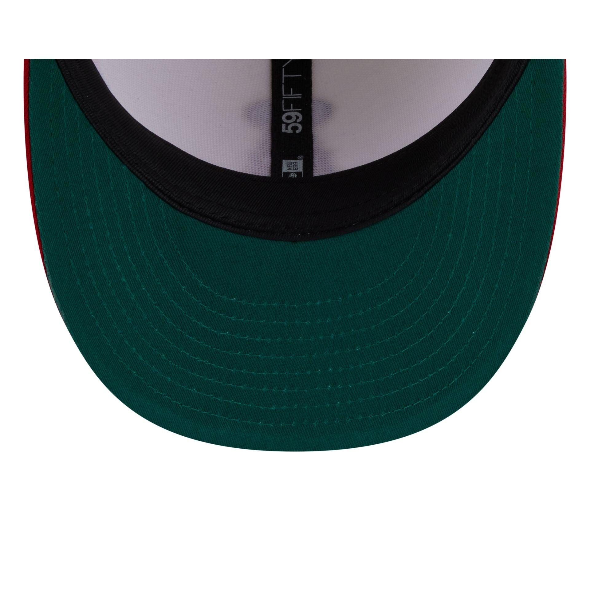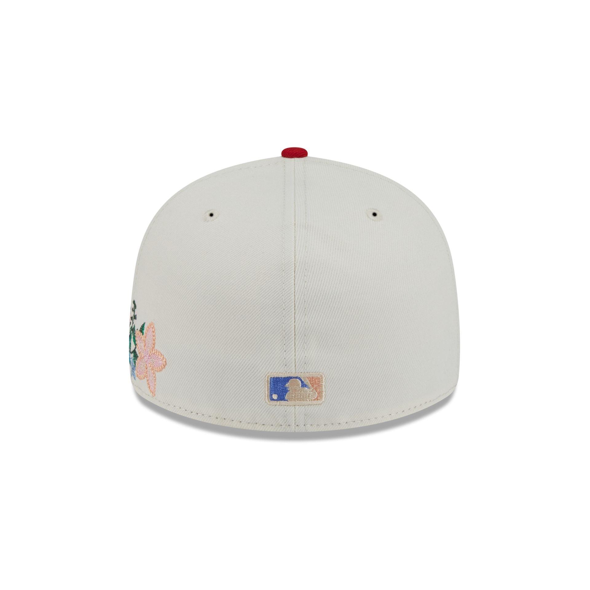 The Los Angeles Angels Tonal Florals White Pre-Curved 59FIFTY Fitted Cap features an embroidered Angels logo at the front panels with a team color visor and a green undervisor. Additional details include chainstitched embroidered flowers with handstitched beading at the left-wear side and a matching MLB Batterman logo at the rear.