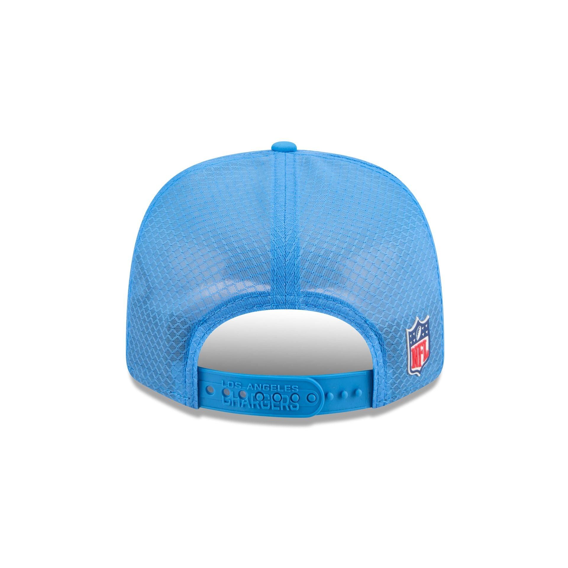 The Los Angeles Chargers 2025 Sideline Hot Weather 9SEVENTY Trucker features a sewn-down silicone Chargers logo patch at the front panels with a water-repellent quill tech fabrication throughout and a quick-dry cushioned sweatband to absorb moisture. Additional details include the Official NFL Shield logo to the right of a soft silicone snapback closure at a light-weight mesh rear. The undervisor is accented with a silicone transfer in the team’s colors.