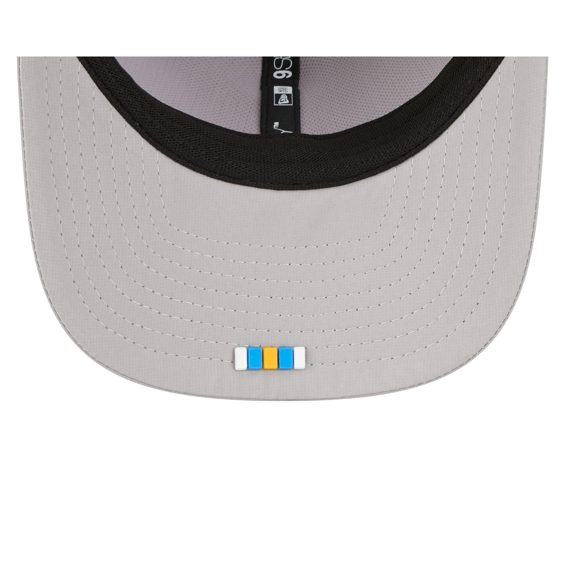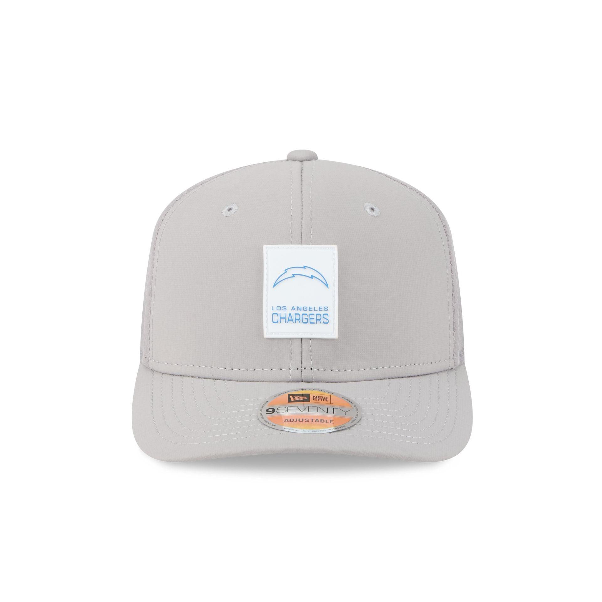 The Los Angeles Chargers 2025 Sideline Hot Weather Gray 9SEVENTY Trucker features a sewn-down silicone Chargers logo patch at the front panels with a water-repellent quill tech fabrication throughout and a quick-dry cushioned sweatband to absorb moisture. Additional details include the Official NFL Shield logo to the right of a soft silicone snapback closure at a light-weight mesh rear. The undervisor is accented with a silicone transfer in the team’s colors.