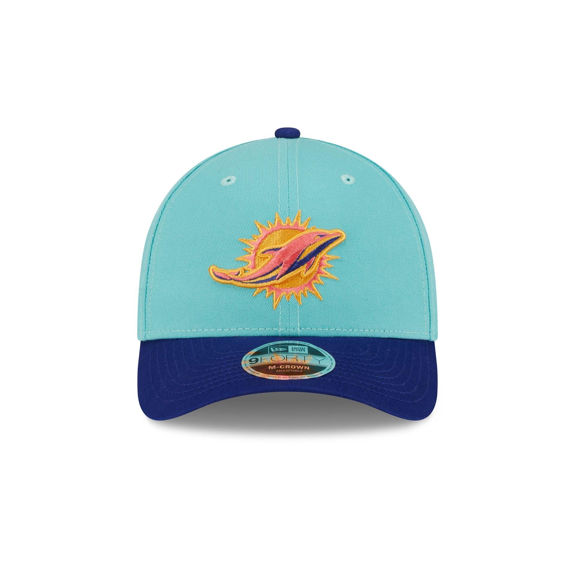 The Miami Dolphins Clear Mint 9FORTY M-Crown Adjustable Cap features an embroidered Dolphins logo at the front panels with a snapback closure at the rear. Additional details include a Silver Season patch at the right-wear with a blue ink visor and a beetroot undervisor.