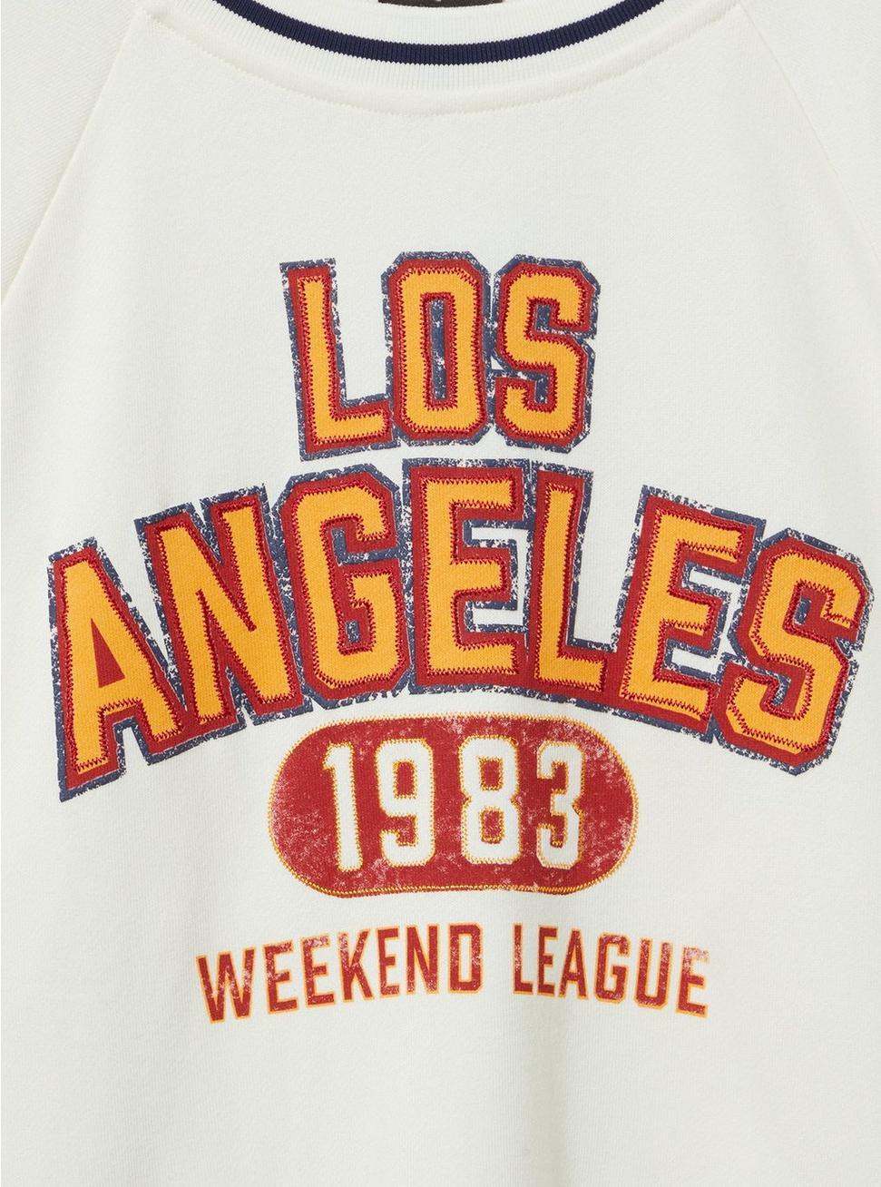 FITMeasures 30'' from shoulder (size 2).MATERIALS + CARECozy Fleece knit fabric: Our essential fleece has a brushed warm interior and a lived-in, casual look.Stretch level: Minimum.60% cotton, 40% polyester.Machine wash cold. Tumble dry low.Imported.DETAILS Crew neckline.Long sleeves.Los Angeles graphic.