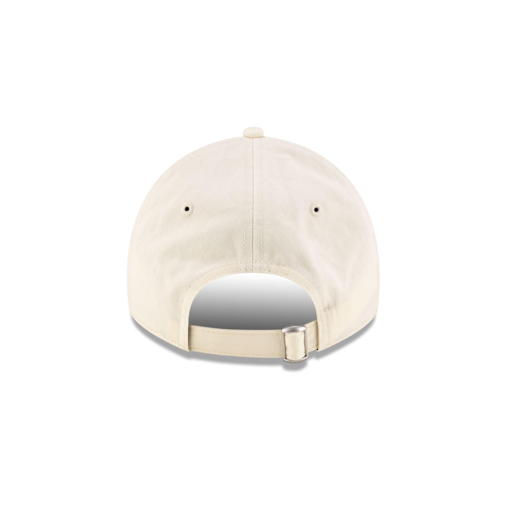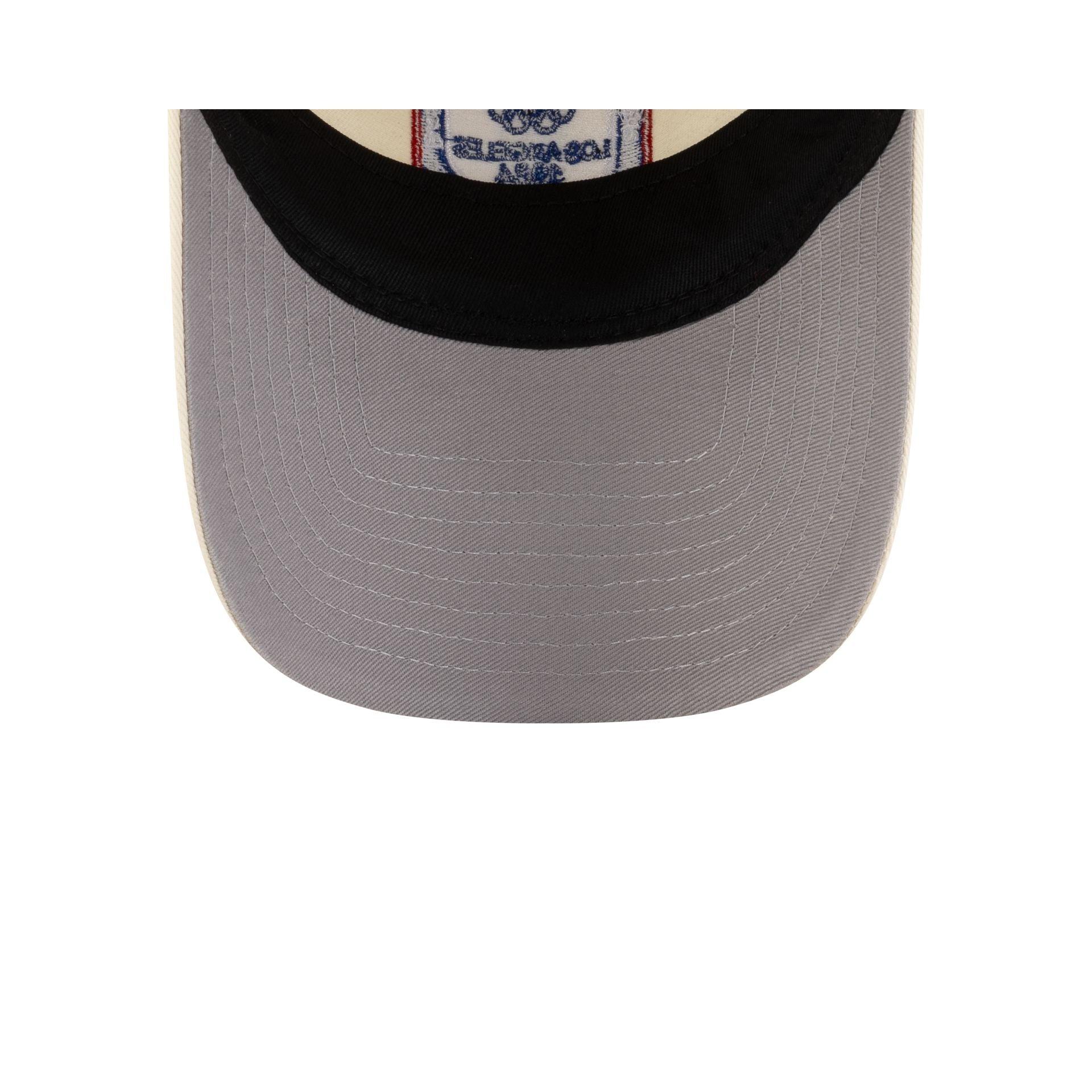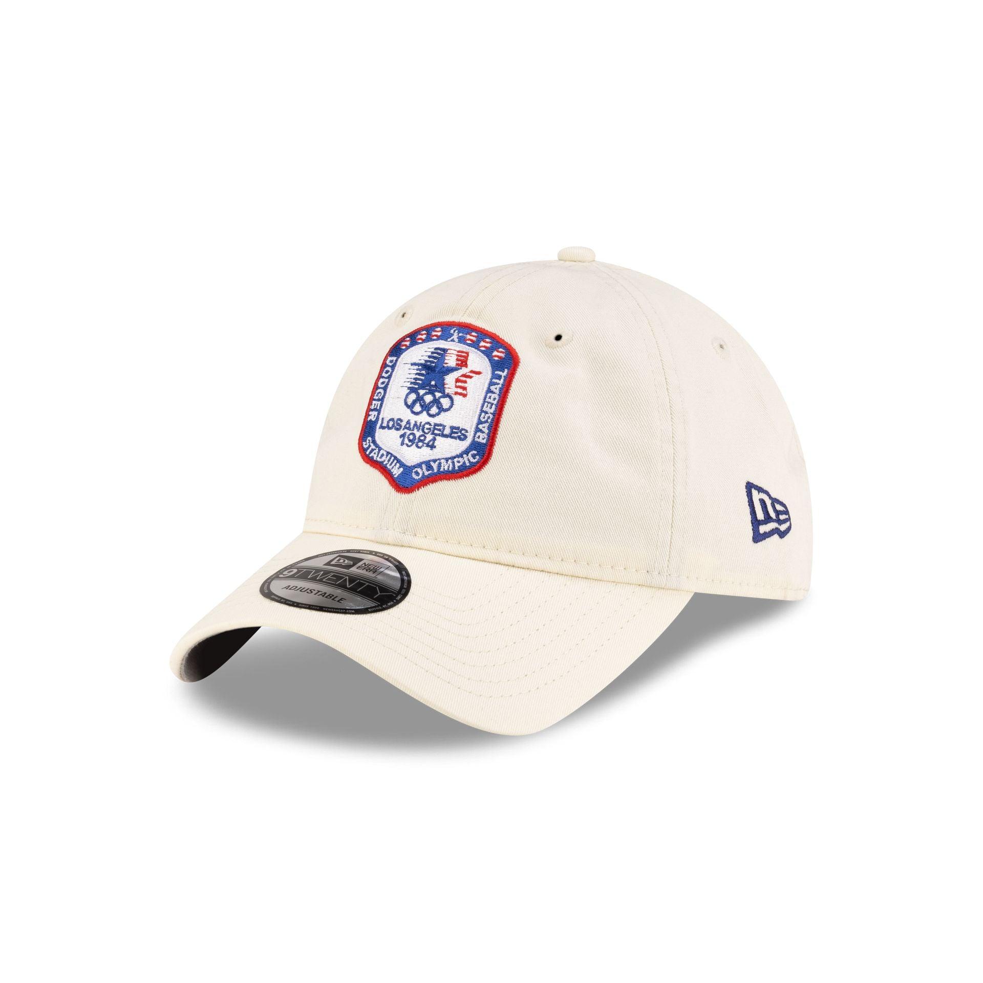 The Los Angeles Dodgers 1984 Olympics Chrome White 9TWENTY Adjustable Cap features an embroidered Dodger Stadium Olympic Baseball patch at the front panels with a Dodgers logo at the right-wear side. Additional details include an adjustable D-Ring closure at the rear and a gray undervisor.