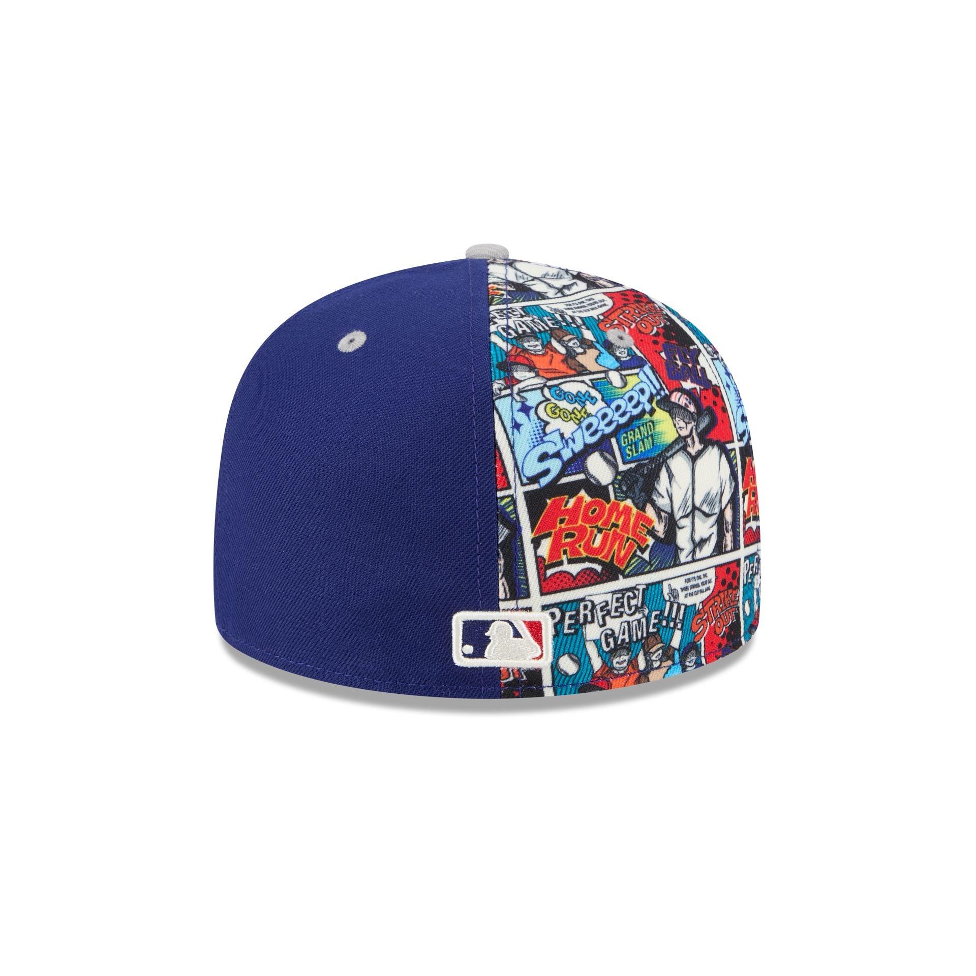 The Los Angeles Dodgers Diamond Hero Edition 59FIFTY Fitted Cap features an embroidered Dodgers onomatopoeia pop logo at the front panels with baseball comic book prints at the front and back panel. Additional details include the MLB Batterman logo at the rear and a gray undervisor.