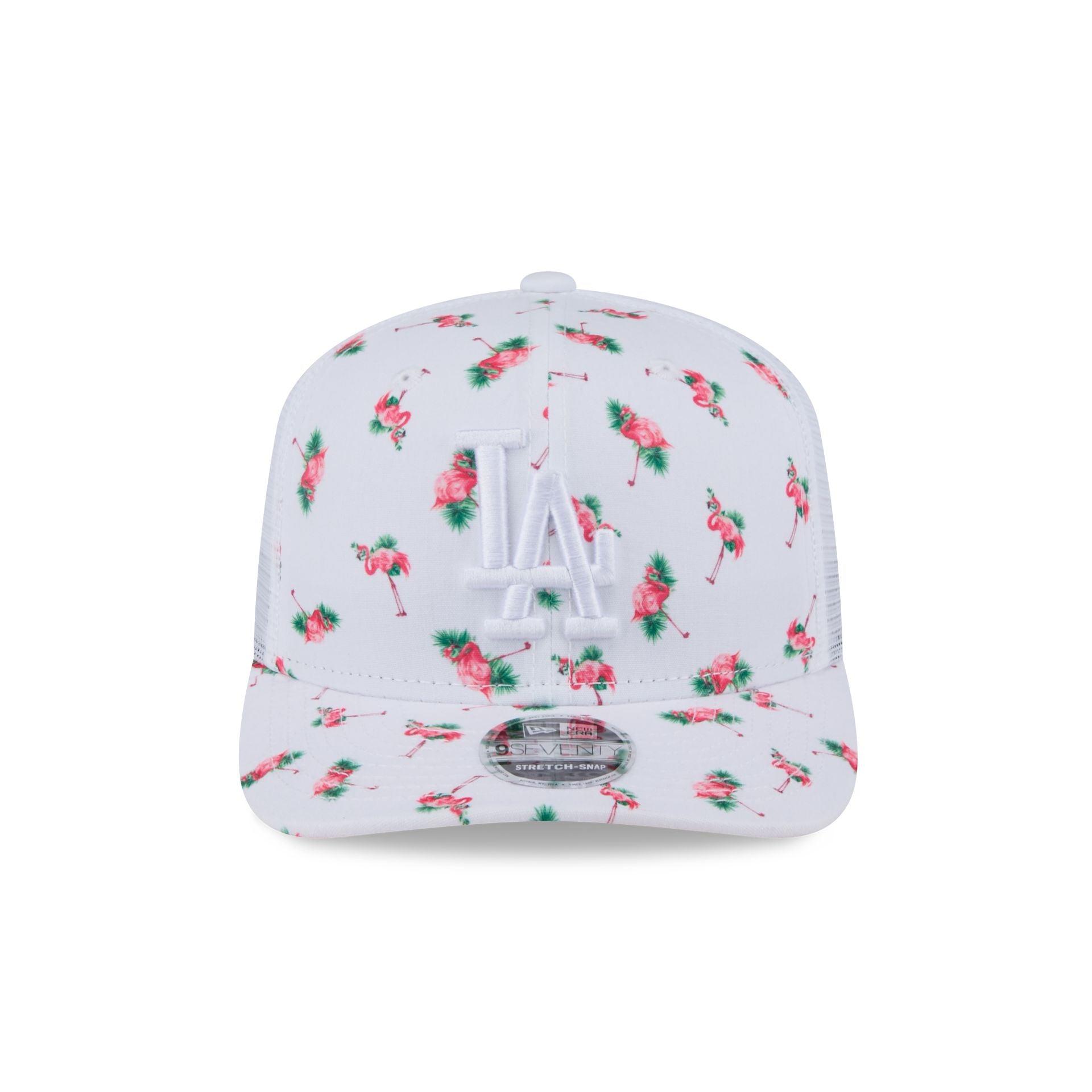 The Los Angeles Dodgers Pattern 9SEVENTY Trucker Hat features an allover flamingo print with an embroidered Dodgers logo at the front panels with an adjustable snapback closure at a mesh rear.
